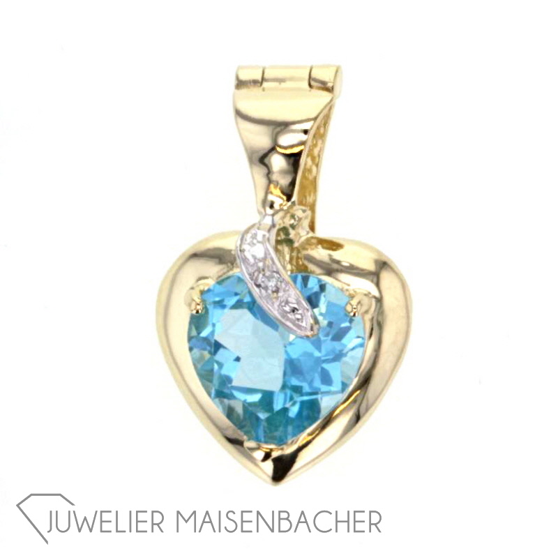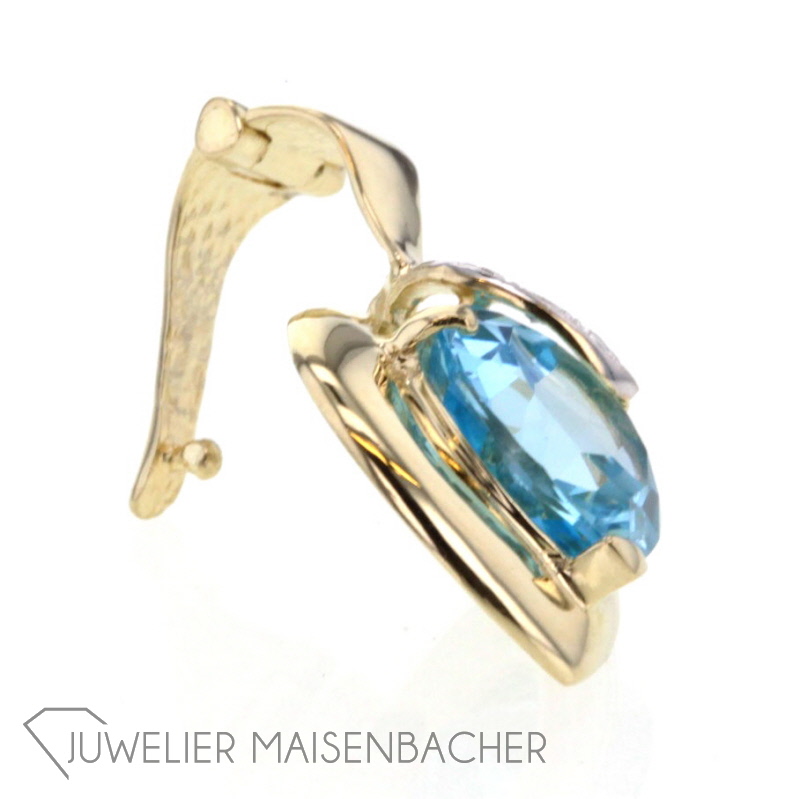 Ein wunderschöner Blautopas in 14K Gold gefasst mit einem zierenden Diamanten. Die Öse lässt sich per Clip öffnen und kann so auch beispielsweise zwischen Perlen gesetzt werden.