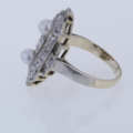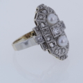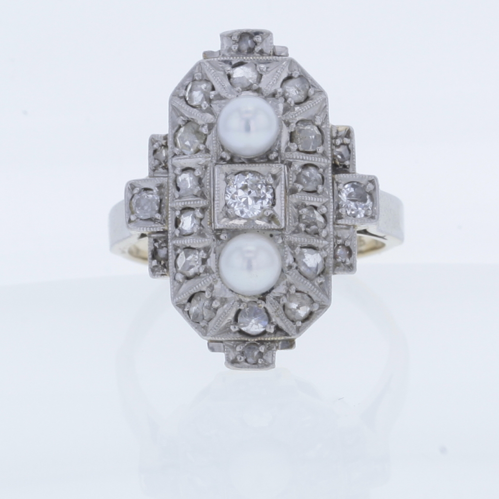 Besondere Akzente setzen zwei edle Perlen mit einem Durchmesser von jeweils ca. 4 mm. Sie bilden einen reizvollen Kontrast zum Funkeln der Diamanten und verleihen dem Ring eine weiche, elegante Note. Das Zusammenspiel aus schimmernden Perlen und facettierten Diamanten ist typisch für die glamouröse Ästhetik des Art Déco und verleiht dem Ring eine zeitlose Raffinesse.
