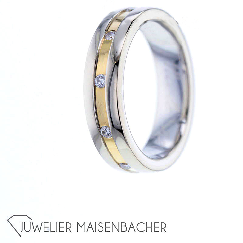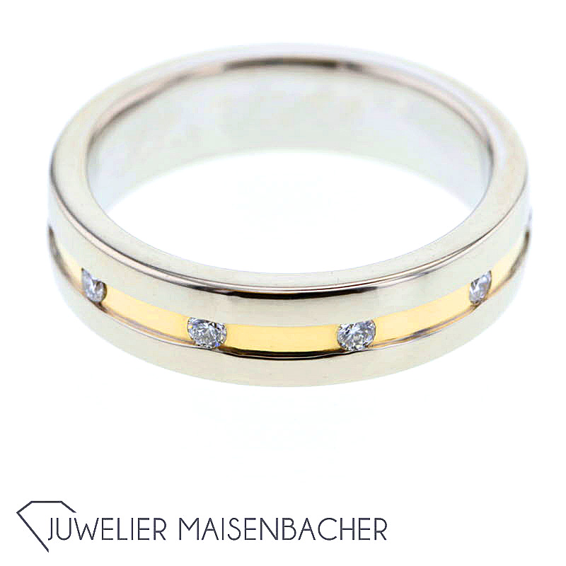 Bandring mit Brillant 585/-Gelb-Weißgold 10 natürliche Diamanten im Brillantschliff insgesamt: ca. 0.20ct. Farbe: Top Wesselton, Feines Weiß (G) Reinheit: VS1-VS2 Ringweite: 53 (Ã 17) Maße Ringschiene: ca. 5mm Bruttogesamtgewicht: 6,9 Gramm