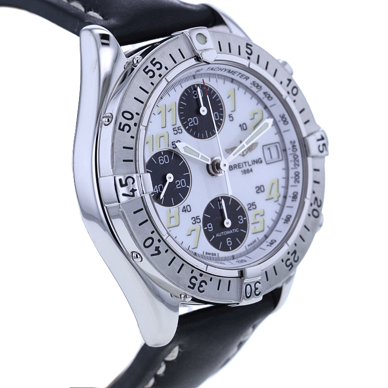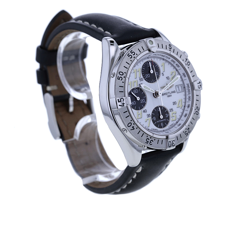 Das massive Edelstahlgehäuse mit einem Durchmesser von 41 mm verleiht der Uhr eine ausdrucksstarke Erscheinung am Handgelenk. In Kombination mit dem klaren weißen Zifferblatt entsteht ein faszinierender Kontrast, der der Uhr eine besonders elegante und zugleich sportliche Anmutung verleiht. Die markante Edelstahllünette unterstreicht den instrumentellen Charakter dieses Chronographen und verleiht ihm jene selbstbewusste Ästhetik, für die Breitling seit Jahrzehnten geschätzt wird.