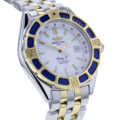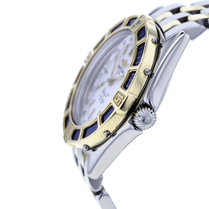 Das Gehäuse wird von einer robusten Lünette aus 18 kt Gelbgold eingefasst, was dem Gesamtbild eine warme Wertigkeit verleiht. Das Armband kombiniert Edelstahl mit Gelbgold und bietet im Pilotstil eine sportliche, aber äußerst elegante Anmutung. Die Stegbreite beträgt 15 mm, und der Tragekomfort wird durch eine Sicherheitsfaltschließe erhöht. Die Tragelänge von ca. 18 cm passt nahezu jedem Handgelenk.