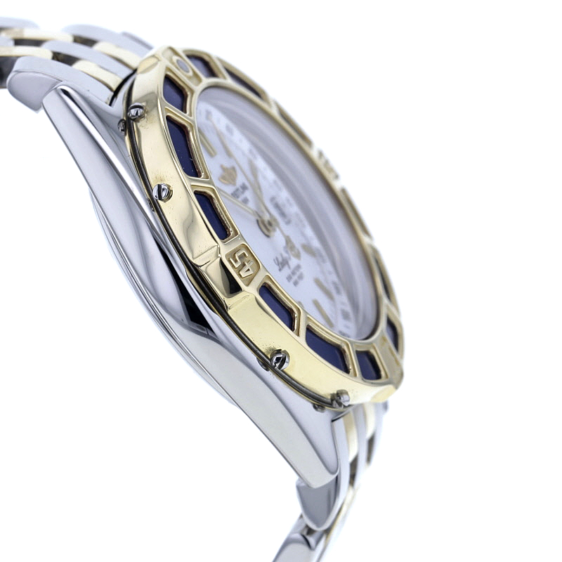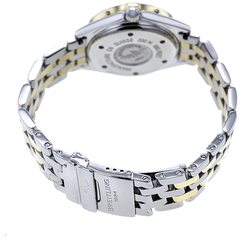 Die Breitling Lady J ist eine elegante,SPORTLICHE Damenuhr, die stilvolle Klassiker mit moderner Uhrentechnik verbindet. In der Referenz D52065 trifft ein Gehäuse aus einer edlen Kombination von Gold und Stahl auf ein sportlich-freches Erscheinungsbild. Mit einem Durchmesser von 30 mm und einer Höhe von 9,4 mm bleibt sie angenehm zierlich am Handgelenk, ohne an Präsenz zu verlieren. Die Zierde aus Gelbgold an der Lünette harmoniert perfekt mit dem Edelstahl-Gehäuse und verleiht der Uhr eine warme, luxuriöse Note.