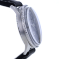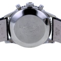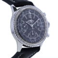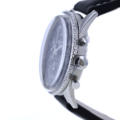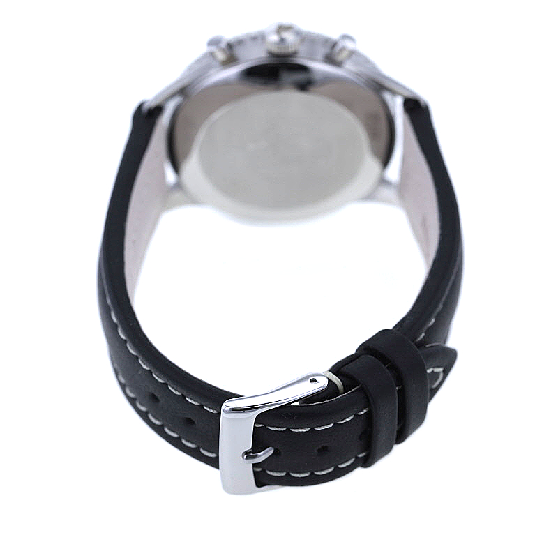 Getragen wird die Navitimer an einem schwarzen Lederarmband, das ihre sportlich-markante Anmutung elegant abrundet. Die Dornschließe aus Edelstahl ist nicht original, fügt sich jedoch harmonisch in das Gesamtbild ein. Mit einer Stegbreite von 22 mm sitzt die Uhr präsent und ausgewogen am Handgelenk.