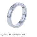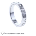 Mit einer Breite von 4 mm wirkt der Ring ausgewogen am Finger, weder zu kühn noch zu zurückhaltend. Die Ringhöhe von 1,8 mm sorgt für eine komfortable Passform und eine angenehme Tragebalance. Der Ring lässt sich problemlos mit Verlobungs- oder Eheringen kombinieren oder solo tragen, um eine dezente, aber dennoch hochwertige Präsenz zu zeigen. Die Materialität – 750er Weißgold – ist robust genug für den täglichen Gebrauch und behält langfristig seinen Glanz bei sorgfältiger