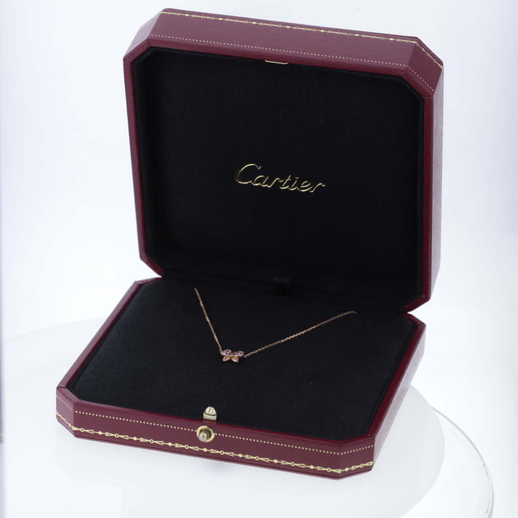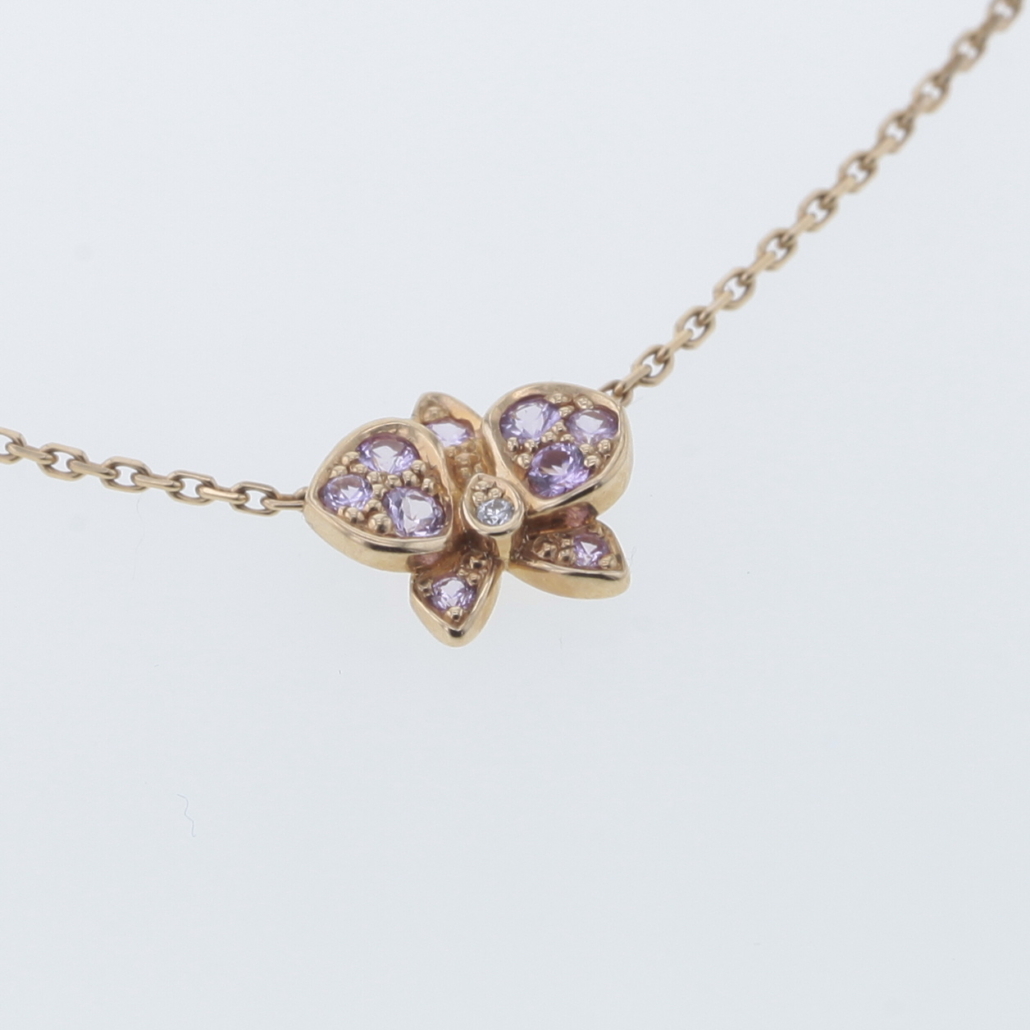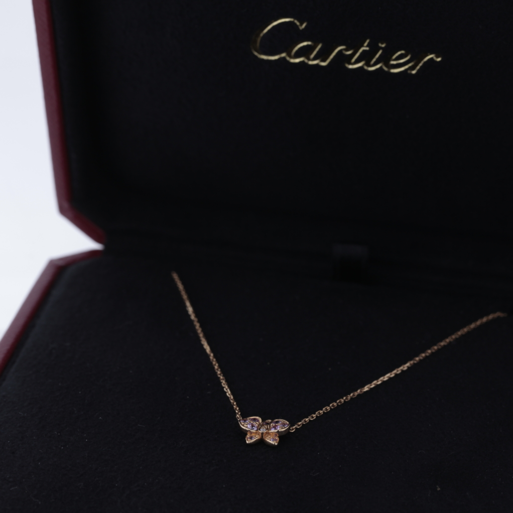 Caresse D`Orchidées par Cartier Kette/Collier besetzt mit rosa Saphiren und Brillant Die Orchidee ist eine beliebte Blume bei Cartier und strahlt eine zarte, feminine Austrahlung aus. Die Zerbrechlichkeit dieser Königin der Blumen wird durch geschickte Handwerkskunst von Cartier sorfälltig wiedergegeben, wobei ihre zarten Blütenblätter aus edelsten, kostbaren Materialien geformt sind. Die Orchidee wurde ertsmals 1925 vom Juwelier verwendet und ist heute ein klassisches Motiv im Cartier-Schmuck. Serienummer: CBM396 Ref.:B7222900 1 natürlicher Diamant im Brillantschliff ca. 0,0054ct. Farbe: Top Wesselton, Feines Weiß (G) Reinheit: VVS 9 pinke Saphire facettiert Tragelänge durch Zwischenoese 39cm-44,5cm Im Lieferumfang erhalten Sie die original Box und Zertifikat von Cartier Sie haben Fragen zu diesen außergewöhnlichen Cartier Schmuck, wir beraten Sie gerne individuell und unverbindlich.