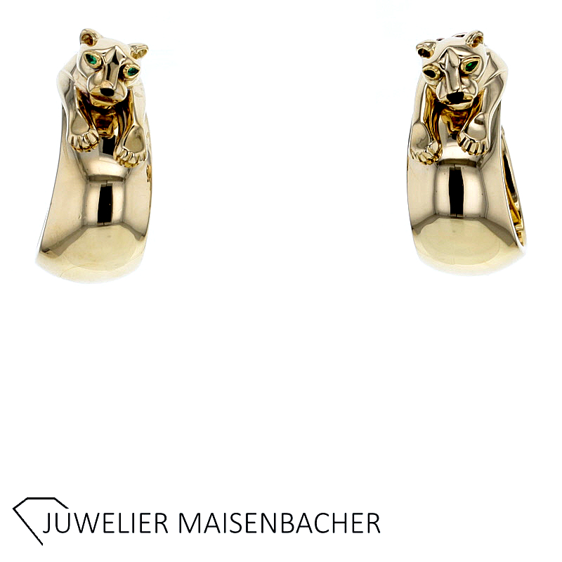 Cartier Creolen/Ohrclip Panthére Kollektion *RARITÃT* Serien Nummer: 626572 750/-Gelbgold Augen aus Tsavorit 33,1 mm x 15,0mm Bruttogesamtgewicht: ca 46,5 Gramm mit original Box und Papiere Haben Sie Fragen zu diesen außergewöhnlichen Creolen, wir beraten Sie unverbindlich und individuell