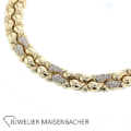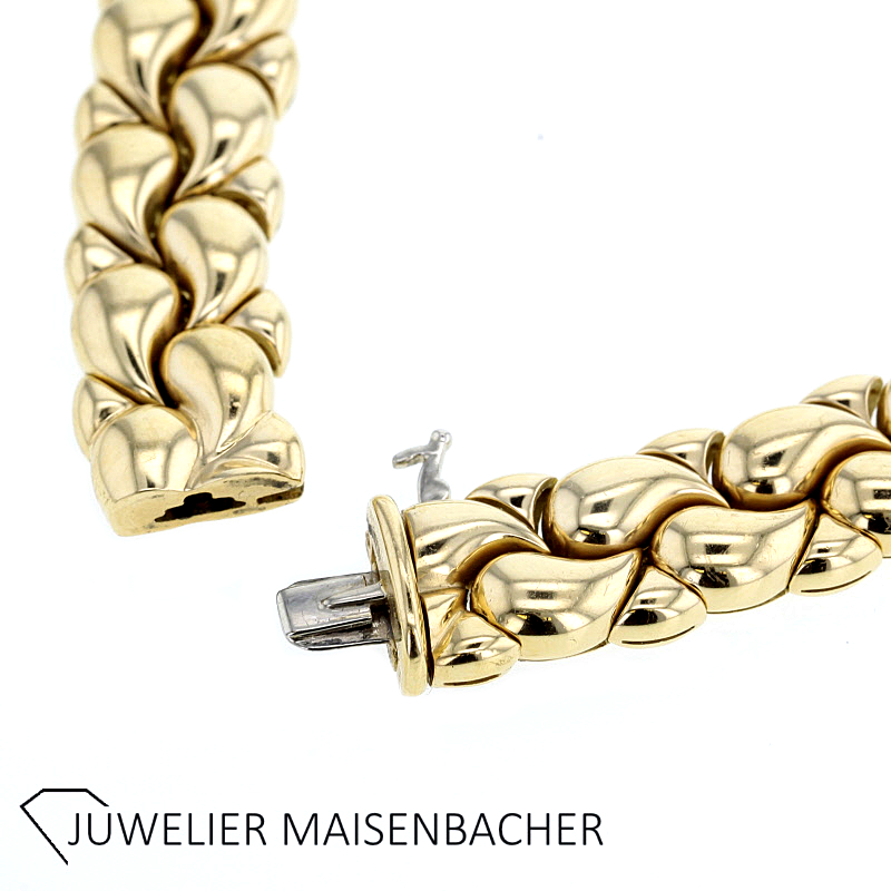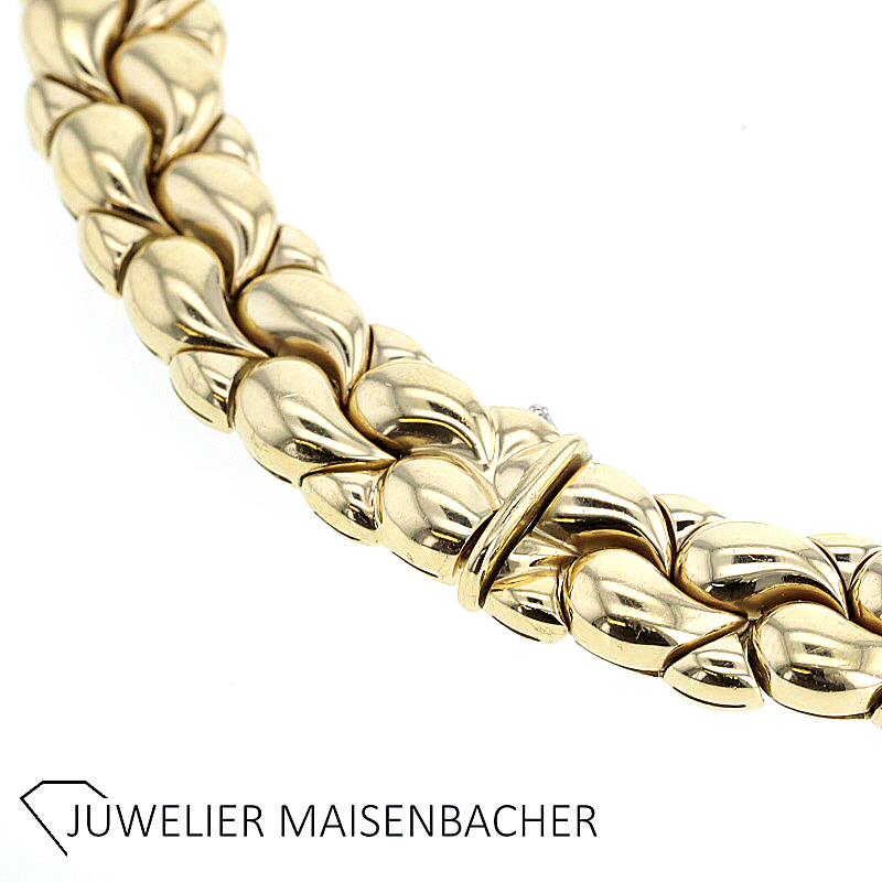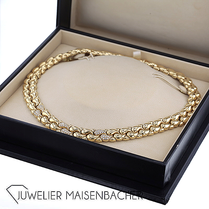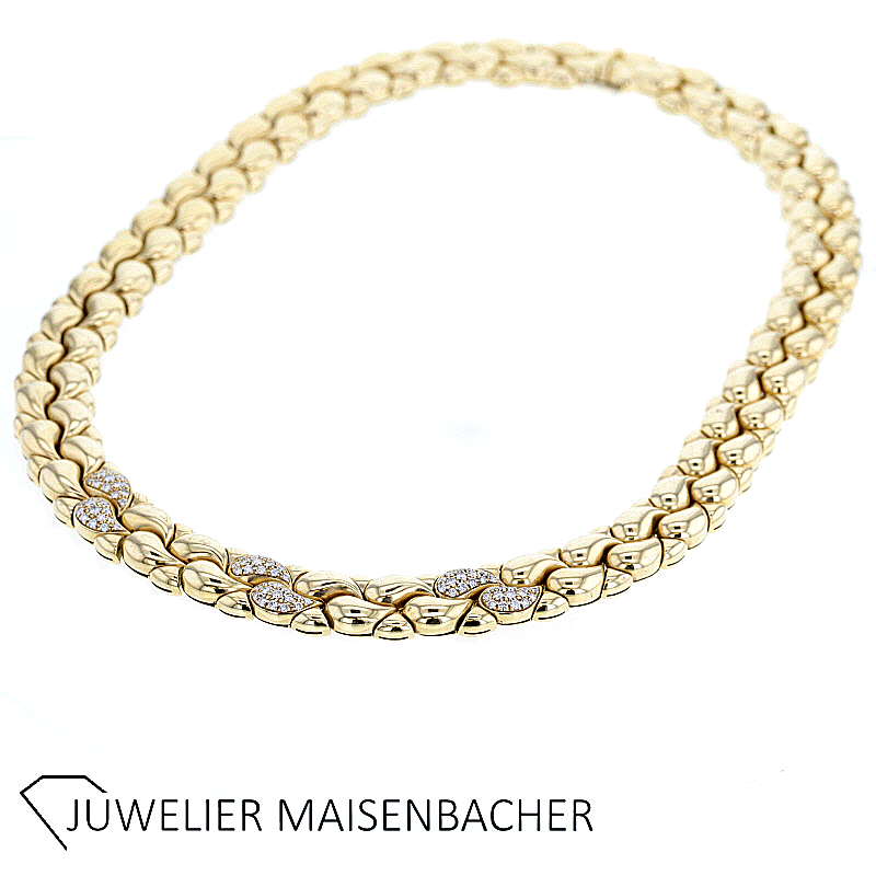 Chopard Casmir Collier mit Diamanten im Brillantschliff Modell-Nr.: 81/1693-43 in 750/- Gelbgold 84 natürliche Diamanten im Brillantschliff insgesamt 1,30 ct Farbe: Top Wesselton, Feines Weiß (G) Reinheit: IF Lupenrein Breite: ca. 13,5 mm Stärke: ca. 5,1 mm Tragelänge: ca. 47 cm Bruttogesamtgewicht: 189,6 Gramm mit original Chopard Zertifikat und hochwertigen Etui Kombinieren Sie dieses außergewöhnliche Collier mit dem Chopard Armreif Art.Nr. COMAR2022101202 und Chopard Ohrclips/Creolen Art. Nr. COMOH20230405-02 Haben Sie Fragen zu diesem exklusiven Chopard Collier, wir beraten Sie unverbindlich und individuell. Â