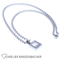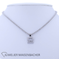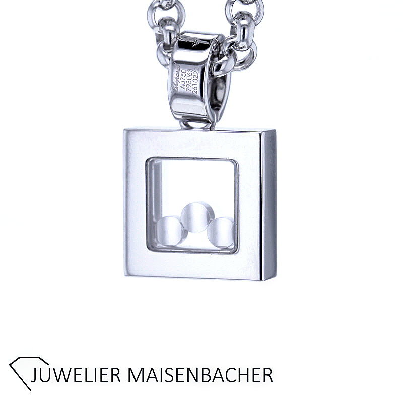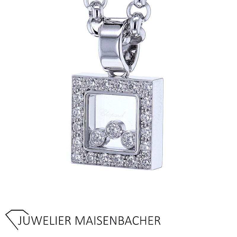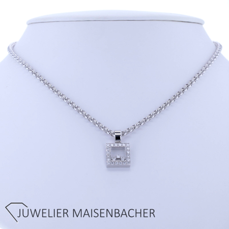 Chopard Happy Diamonds Square Collier in 750er Weißgold mit insgesamt 23 Brillanten im Brillantschliff. Im Anhänger befinden sich in der Mitte 3 schwebende Brillanten zwischen zwei Saphirgläsern. Rundum verziert der Anhänger zusätzlich mit 20 weiteren Brillanten. Farbqualität: feines Weiß Top Wesselton (G); Reinheit: VVS bis VS. Gesamt-Diamantengewicht ca. 0,55 ct. Kettenlänge ca. 42 cm, Breite ca. 3,4 mm. Anhänger-Abmessungen: Länge ca. 21,4 mm, Breite ca. 12,9 mm. Bruttogesamtgewicht Collier ca. 25,1 g.