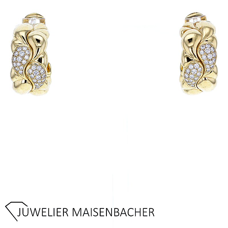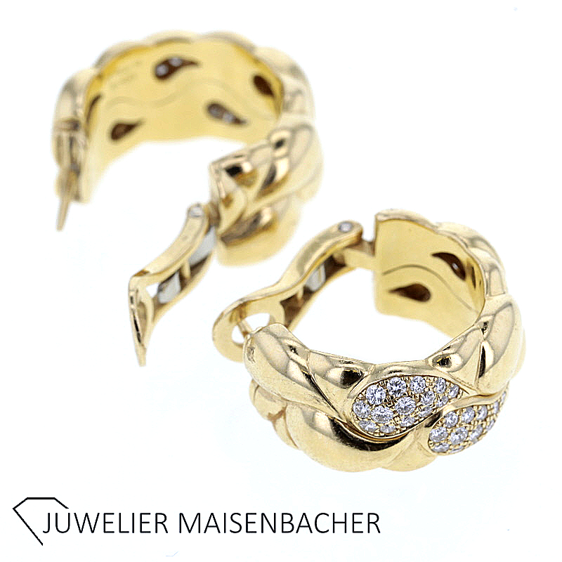 Chopard Casmir Creolen/Ohrclips mit Diamanten im Brillantschliff Modell-Nr.: 84/1722-43 Seriennummer: 9304726 in 750/- Gelbgold 56 natürlichen Diamanten im Brillantschliff insgesamt 0,66 ct. Farbe: Top Wesselton, Feines Weiß (G) Reinheit: IF, Lupenrein Breite: ca. 11,4 mm Stärke: ca. 3,3 mm Tragelänge: à ca. 21,6mm Bruttogesamtgewicht: ca. 21,2 Gramm mit original Chopard Zertifikat Kombinieren Sie diese außergewöhnlichen Creolen mit dem Chopard Casmir Armreif Art.Nr. COMAR2022101202 und/oder Chopard Collier Art. Nr. comke20230405-01 Haben Sie Fragen zu diesem exklusiven Chopard Creolen/Ohrstecker, wir beraten Sie unverbindlich und individuell