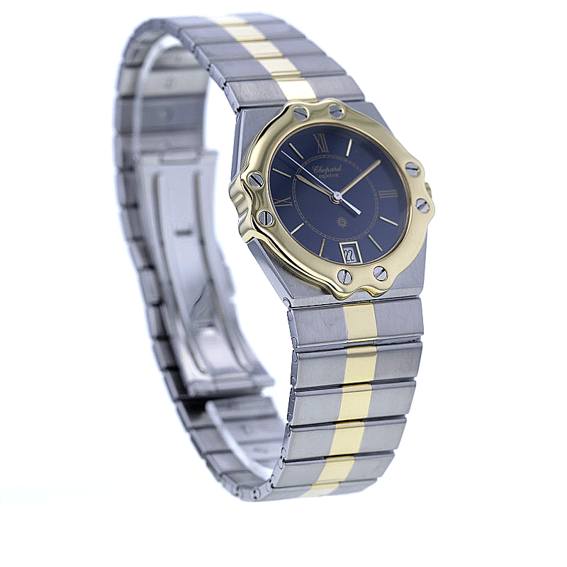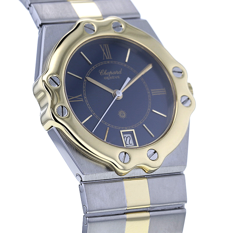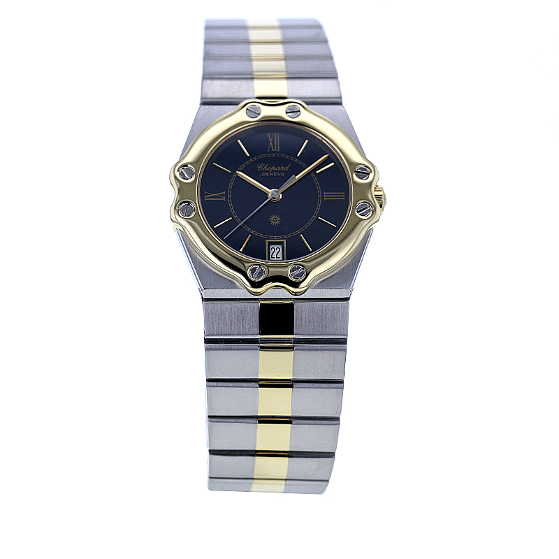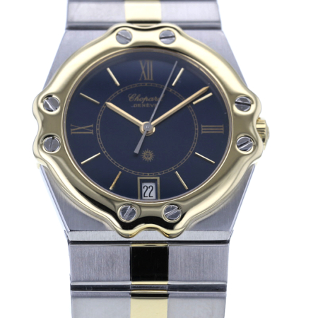 Die Chopard St. Moritz Medium Ref. 8023 verkörpert auf eindrucksvolle Weise die elegante Sportlichkeit, für die das Haus Chopard seit Jahrzehnten geschätzt wird. Dieses charaktervolle Modell aus den 1990er-Jahren vereint luxuriöse Materialien, feine Proportionen und ein ausdrucksstarkes Design zu einer Armbanduhr mit unverwechselbarer Präsenz. Als stilvoller Zeitmesser für Damen und Herren begeistert sie durch ihre gelungene Balance aus klassischer Noblesse und souveräner Alltagstauglichkeit.