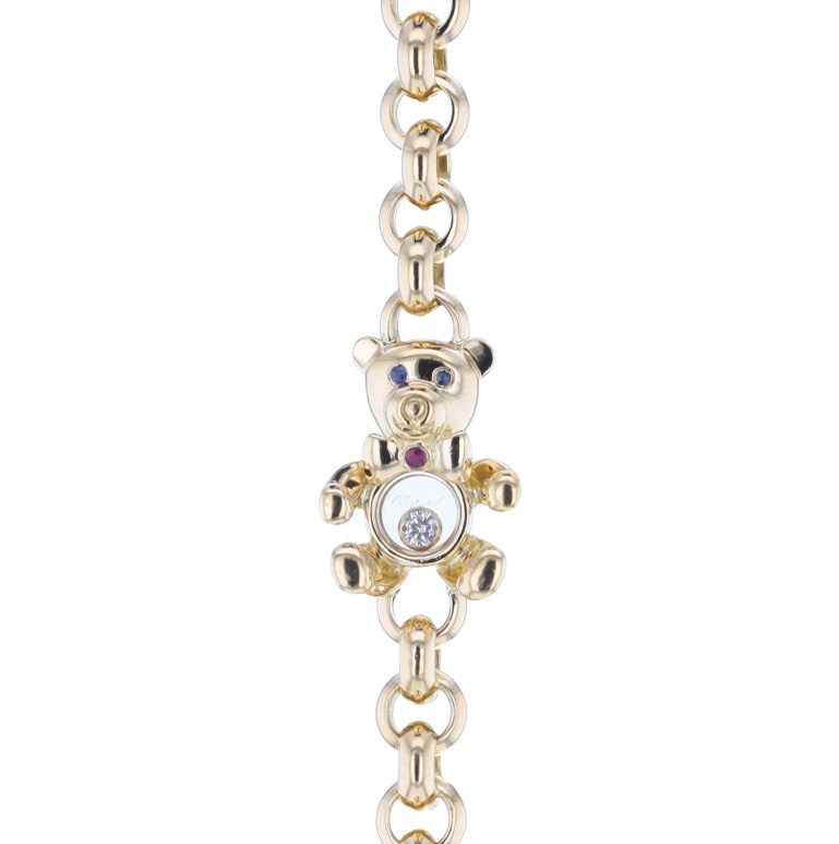 Im Zentrum des Bären befindet sich zudem ein funkelnder Stein, der das Licht einfängt und dem Armband zusätzliche Strahlkraft verleiht. Diese Kombination aus farbigen Edelsteinen und klassischem Glanz schafft ein spannendes Zusammenspiel aus Eleganz und Verspieltheit. Der Happy Diamond weist eine Qualität im Bereich VVS–VS auf und besitzt und ein Gewicht von etwa 0,05 ct, wodurch er trotz seiner zarten Größe eine schöne Brillanz entfaltet.
