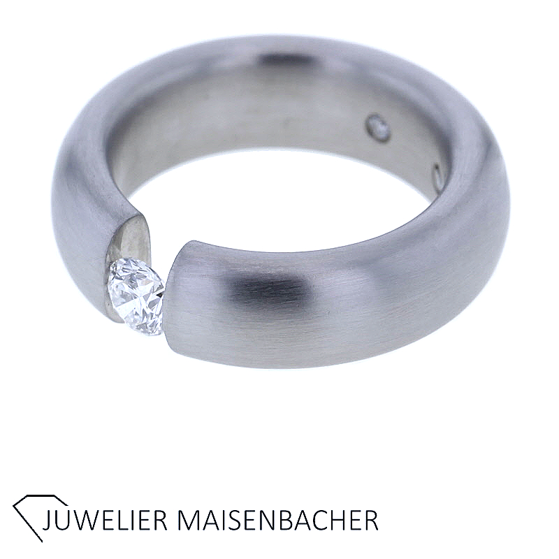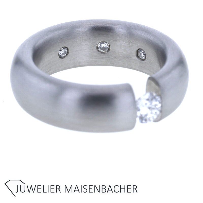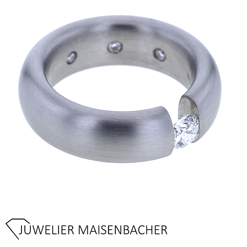 Dieses Schmuckstück besticht durch klare Linien, hochwertige Materialien und ein stilvolles Spiel aus Licht und Glanz. Der Spannring aus 600er Platin setzt einen auffälligen Brillanten im Zentrum grazil in Szene, während drei weitere Diamanten die Ringschiene schmücken. Insgesamt liefern vier Diamanten im Brillantschliff ein funkelndes Gesamtergebnis von ca. 0,34 ct. Der zentrale Stein im Spannring fasst einen Brillanten von ca. 0,28 ct, flankiert von drei weiteren Brillanten in der Ringschiene mit insgesamt ca. 0,06 ct. Farbe der Diamanten: Weiß (Wesselton H); Reinheit: VS1 – hohe Klarheit mit beeindruckendem Glanz. Bruttogesamtgewicht ca. 15,2 g. Ringgröße 51 (Ø ca. 16,3 mm). Eine perfekte Wahl für Liebhaber eleganter, zeitloser Juwelen mit hohem Tragekomfort.