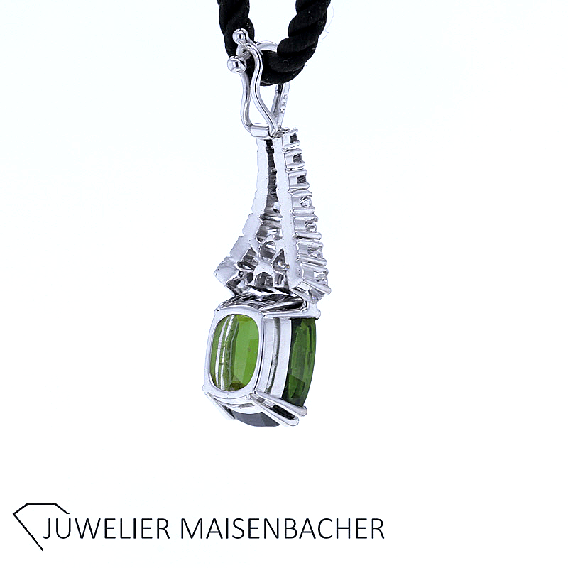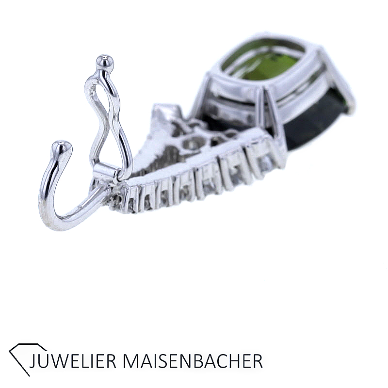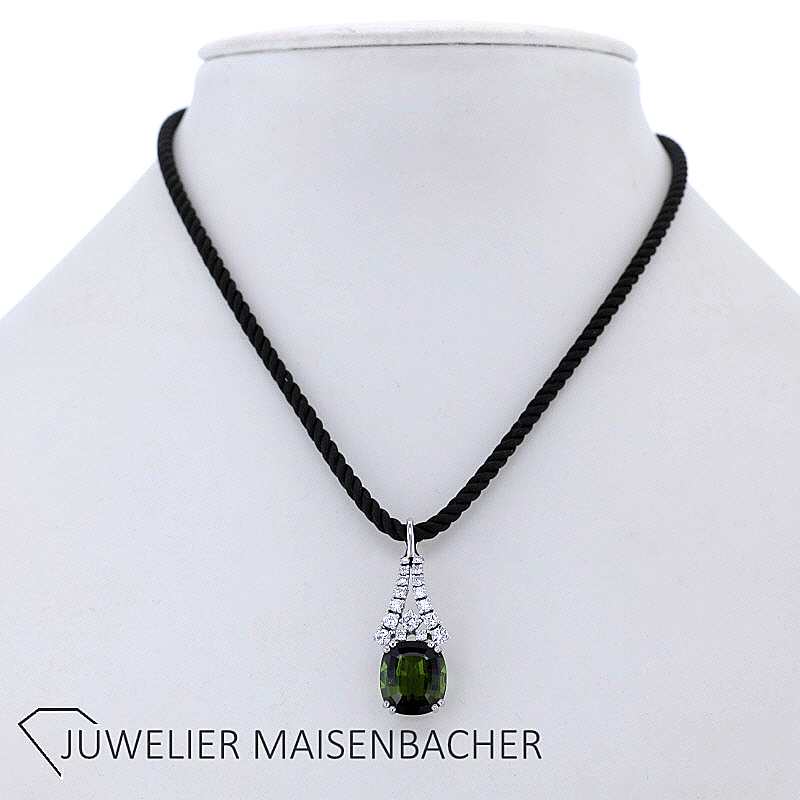 Dieser Turmalinanhänger vereint ein großes, sattgrünes Ovalfacett-Turmalin von über 5 ct mit funkelnden Brillants Diamonds in 585 Weißgold. Die harmonische Proportion, die hochwertige Verarbeitung und die ausgesuchten Materialien machen ihn zu einem herausragenden Schmuckstück für besondere Anlässe oder als bleibende Wertanlage im Schmuckkästchen.