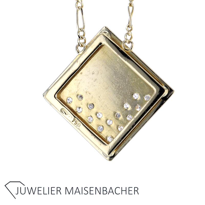 Der Anhänger misst ca. 18,6 x 18,7 mm und präsentiert sich in einer harmonischen, nahezu quadratischen Form. Insgesamt 16 funkelnde Diamanten zieren das Schmuckstück und verleihen ihm eine strahlende, luxuriöse Ausstrahlung. Die Steine sind im klassischen Achtkantschliff gearbeitet, der für sein lebendiges Lichtspiel und seine elegante Brillanz geschätzt wird. Mit einem Gesamtgewicht von ca. 0,20 ct setzen die Diamanten dezente, aber wirkungsvolle Akzente.