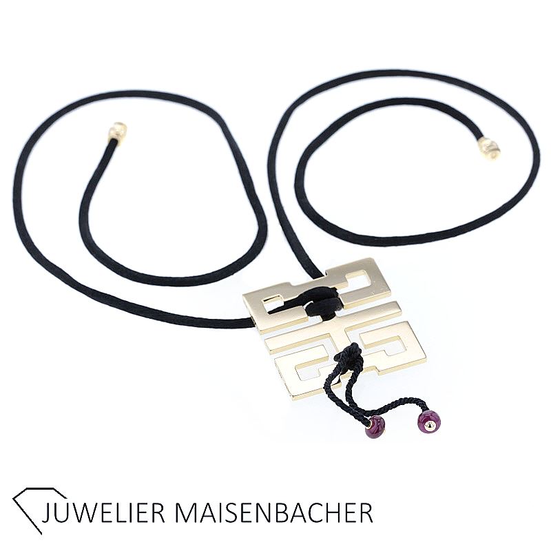 Dieses Stück erzählt eine Geschichte von mutiger Schönheit und feinem Handwerk: Der klare geometrische Reiz des Anhängers trifft auf die feine Wärme des Gelbgolds, während die rubinroten Kugeln dem Glow eines verführerischen Flairs Nachdruck verleihen. Ein Schmuckstück, das Blicke magisch anzieht und zugleich eine subtile, luxuriöse Selbstverständlichkeit ausstrahlt.