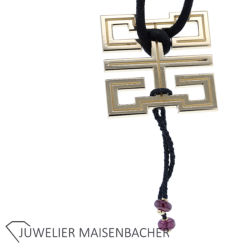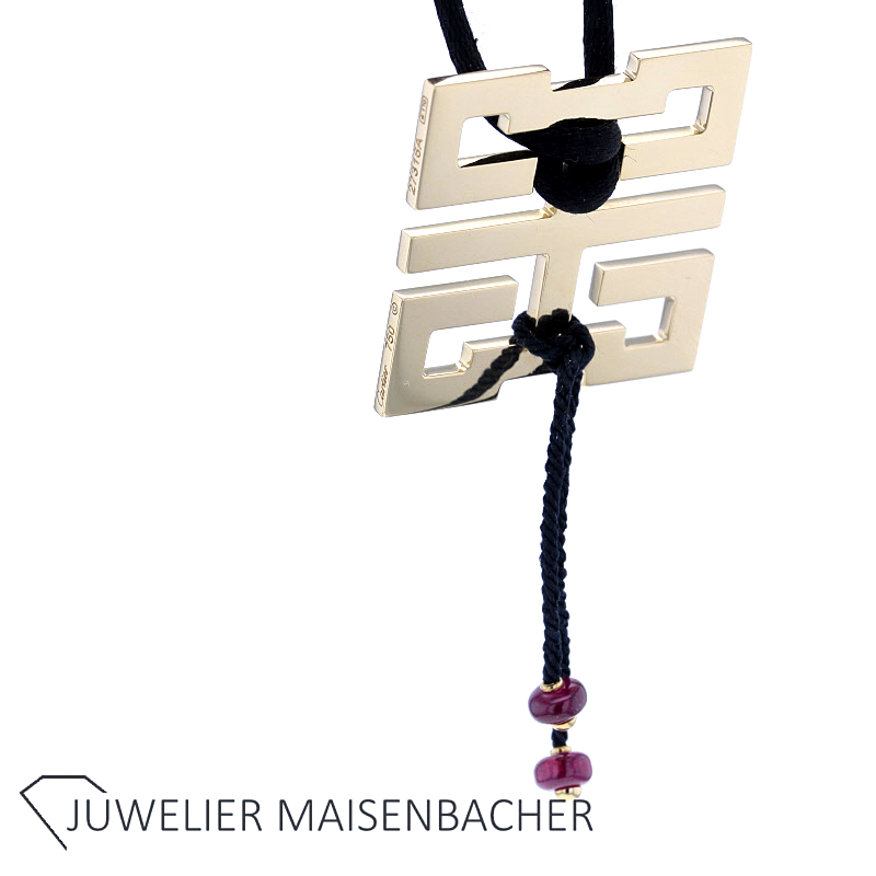 Tauchen Sie ein in die markante Magie der Kollektion Le Baiser du Dragon. Dieses außergewöhnliche Schmuckstück vereint ikonische Eleganz mit kunstvoller Dynamik: Ein quadratisch durchbrochen gearbeiteter Anhänger aus 750er Gelbgold fängt Licht in seinen kühnen Linien ein und trägt, feinsinnig befestigt, zwei rubinrote Kugeln, die im Kontrast zu dem goldenen Gewebe strahlen.