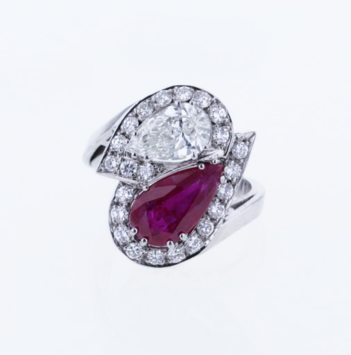 Ein prachtvoller Ring aus 950er Platin, der mit seiner Kombination aus großem Tropfendiamanten, intensiv rotem Rubin und funkelnden Brillanten ein echtes Highlight jeder Schmucksammlung darstellt.