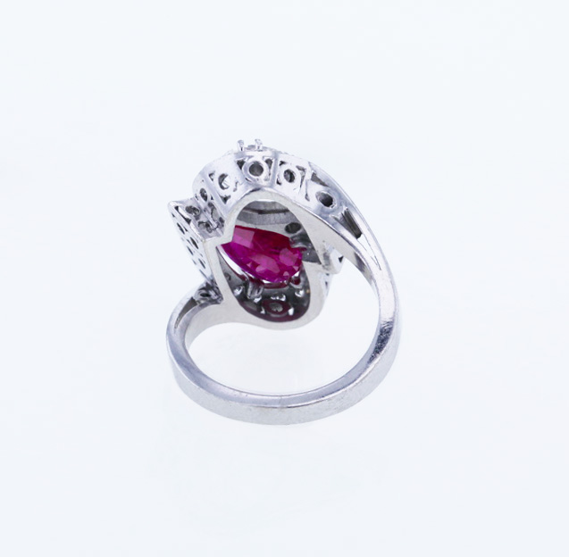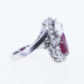 Besonders reizvoll ist bei diesem Ring das Zusammenspiel aus dem kühlen, edlen Glanz des Platins, dem strahlenden Weiß der Diamanten und dem intensiven Rot des Rubins. Diese klassische und zugleich äußerst wirkungsvolle Farbkombination verleiht dem Ring eine exklusive, zeitlose Schönheit. Der Entwurf wirkt feminin, glamourös und zugleich stilvoll anspruchsvoll — ein Schmuckstück für Liebhaberinnen besonderer Edelsteine und hochwertiger Handwerkskunst.