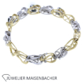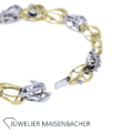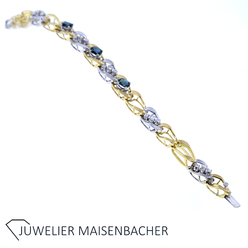 Dieses Armband aus 750er Bi-Color-Gold vereint Eleganz und zeitlose Schmuckkunst. Die Kombination aus Weiß- und Gelbgold schafft einen spannenden Kontrast, der das Design lebendig wirken lässt. Drei Saphire im Ovalfacettenschliff bilden das Highlight neben 15 funkelnden Brillantschliff-Diamanten. Alle Steine sind natürlich und hochwertig verarbeitet, wodurch das Armband einen luxuriösen Glanz ausstrahlt.