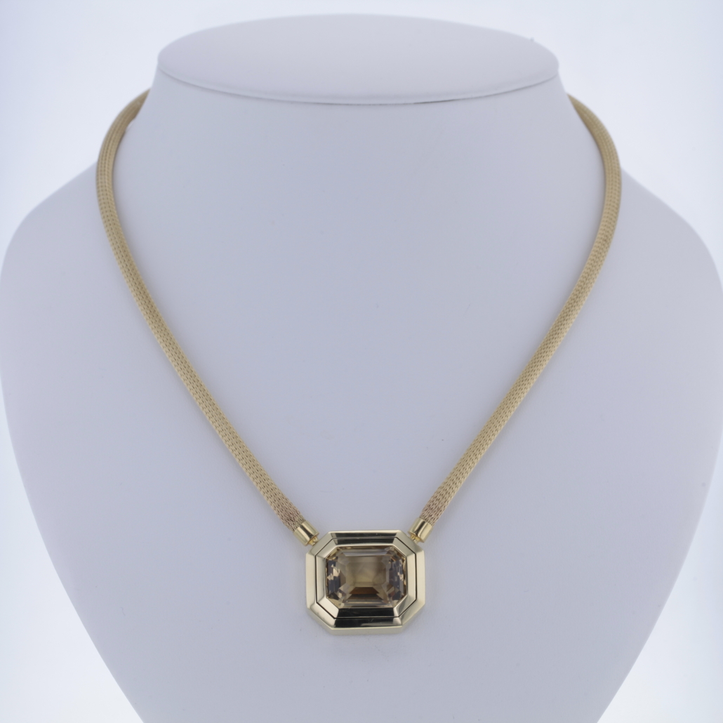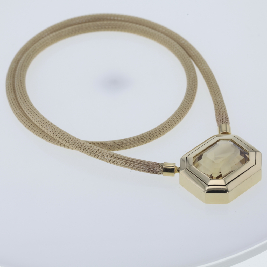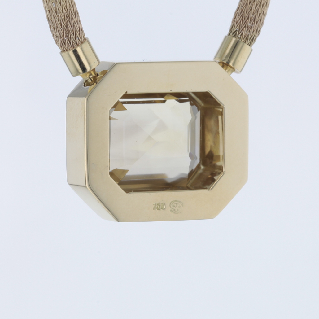 SCHÃFFER Handgefertigter Schmuck, Bielefeld Einzigartiges handgefertiges Collier mit einem klarem Citrin in einer wunderschöner Fassung 750/-Gelbgold wunderschöner Edelstein Citrin Achteck ca. 12 ct. Der außergewöhnliche Anhänger wird rechts und links im Bajonetverschluß eingehangen. Maße Anhänger: 28,7mm x 24,5mm 10,9mm Bruttogesamtgewicht Anhänger: 19,1 Gramm Tragelänge Strickliesl Kette: ca. 47,0cm Tragelänge mit Anhänger: ca. 50 cm Bruttogesamtgewicht: 35,0 Gramm Mit hochwertigen Etui Bei Fragen zu diesem einmaligen Schmuckstück, wir beraten Sie individuell und unverbindlich