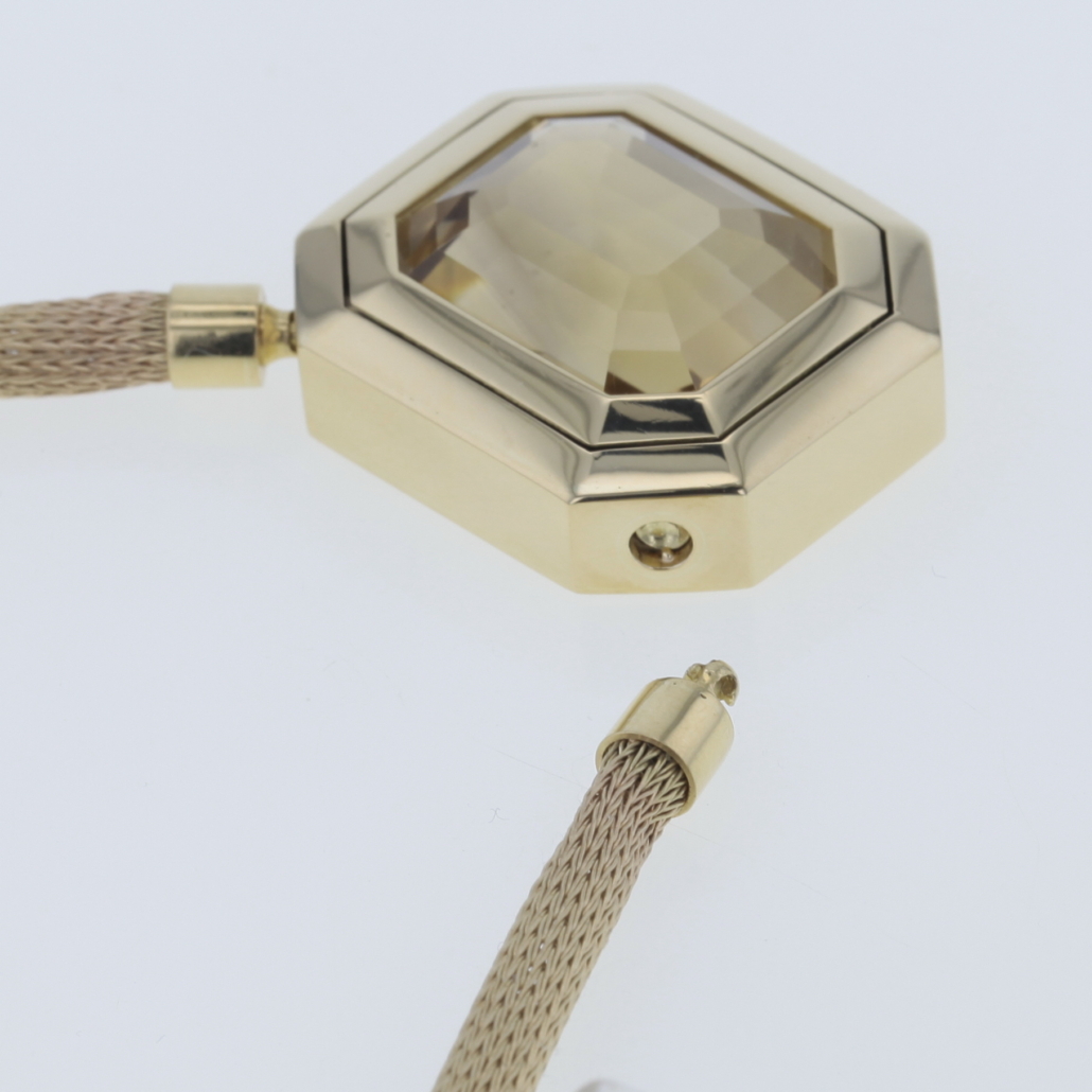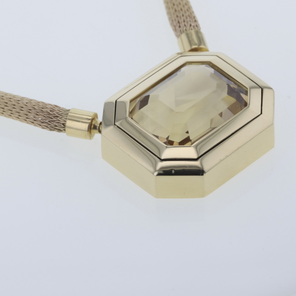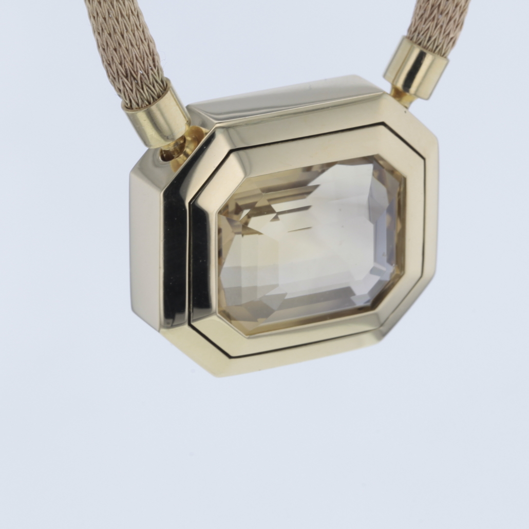 SCHÃFFER Handgefertigter Schmuck, Bielefeld Einzigartiges handgefertiges Collier mit einem klarem Citrin in einer wunderschöner Fassung 750/-Gelbgold wunderschöner Edelstein Citrin Achteck ca. 12 ct. Der außergewöhnliche Anhänger wird rechts und links im Bajonetverschluß eingehangen. Maße Anhänger: 28,7mm x 24,5mm 10,9mm Bruttogesamtgewicht Anhänger: 19,1 Gramm Tragelänge Strickliesl Kette: ca. 47,0cm Tragelänge mit Anhänger: ca. 50 cm Bruttogesamtgewicht: 35,0 Gramm Mit hochwertigen Etui Bei Fragen zu diesem einmaligen Schmuckstück, wir beraten Sie individuell und unverbindlich