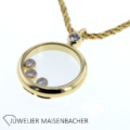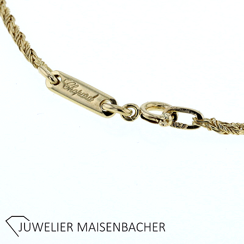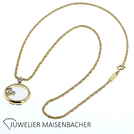 Kette Chopard mit Anhänger Happy Diamonds Icons mit 4 Brillanten 750/-Gelbgold 3 natürliche schwebende Diamanten im Brillantschliff insgesamt: ca 0,15 ct. Farbe: Top Wesselton, Feines Weiß (G) Reinheit: IF-VVS 1 natürlicher Diamant im Brillantschliff ca 0,05 ct. Farbe: Top Wesselton, Feines Weiß (G) Reinheit: IF-VVS Tragelänge Kette: ca 41 cm Tragelänge mit Anhänger: ca 43cm Bruttogesamtgewicht: ca 9,0 Gramm Verschluss: Karabiner Sie haben Fragen zum Chopard Schmuck, wir beraten Sie gerne individuell und unverbindlich