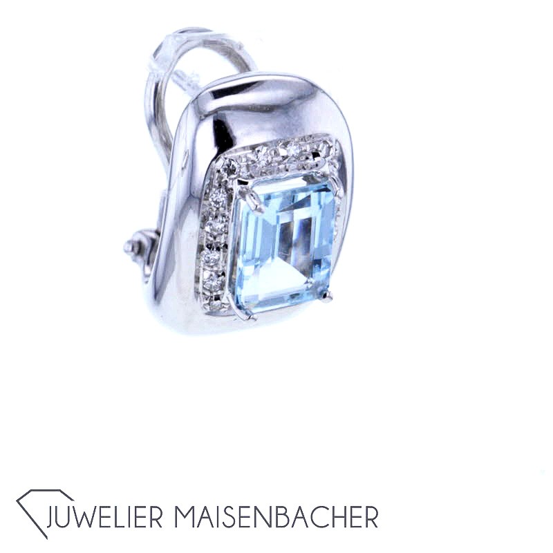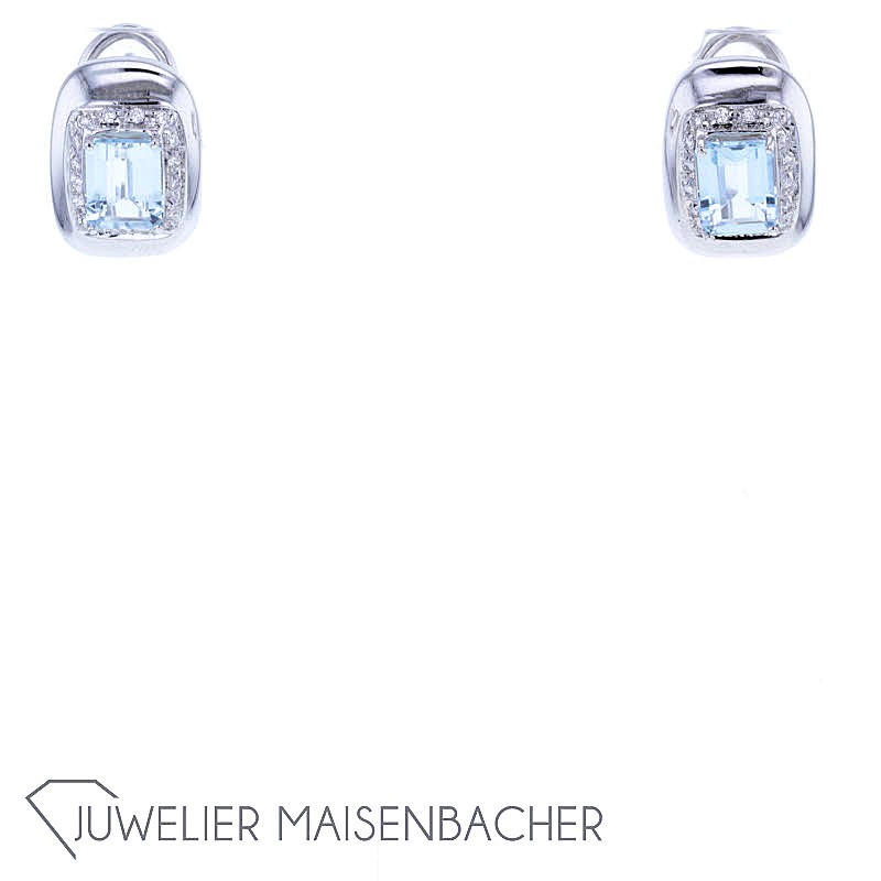 Klassische Creolen mit Aquamarin und Brillanten 750/- Weißgold 32 natürliche Diamanten im Brillantschliff insgesamt: ca. 0.16ct. Farbe: Top Wesselton, Feines Weiß (G) Reinheit: VS2-SI2 2 Aquamarine in Emerald Cut insgesamt: ca. 2.08 ct. Maße: ca. 17 x 12mm Bruttogesamtgewicht: ca. 11,36 Gramm