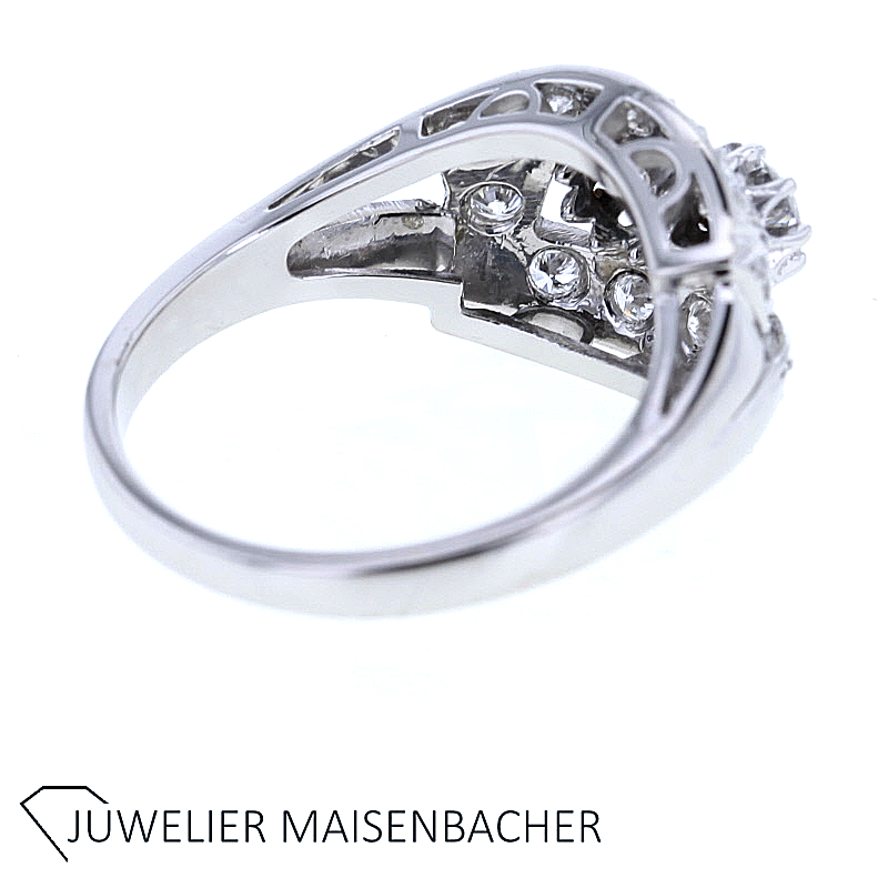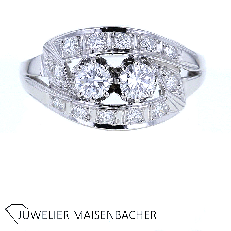 Besetzt ist der Ring mit 14 natürlichen Diamanten im Brillantschliff mit einem Gesamtgewicht von ca. 0,64 ct. Die Steine überzeugen durch ihre schöne Farbqualität in Weiß / Wesselton (H) und eine Reinheit von VS bis SI. Dadurch entsteht ein lebendiges, harmonisches Funkeln, das die elegante Linienführung des Rings eindrucksvoll unterstreicht. Die Brillanten sind wirkungsvoll arrangiert und verleihen dem Ringkopf eine luxuriöse, lichtreiche Ausstrahlung.