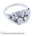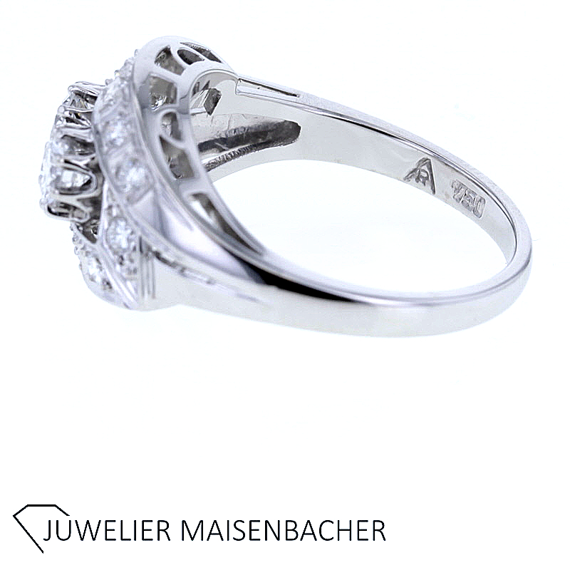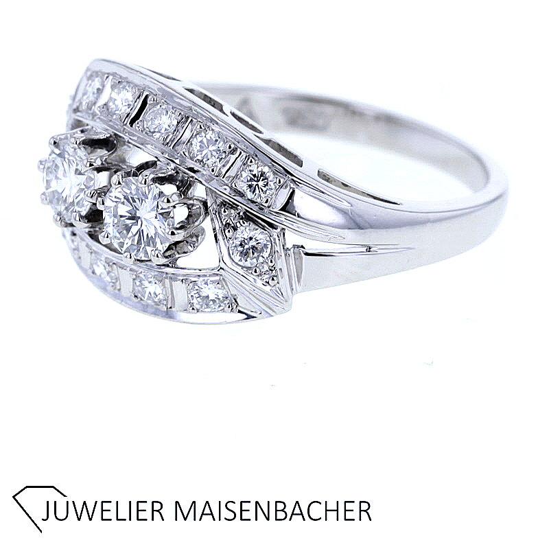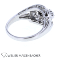 Besonders ausdrucksstark zeigt sich der Ringkopf mit Maßen von ca. 16,8 mm Länge, 11,5 mm Breite und 6,5 mm Höhe. Diese Proportionen verleihen dem Ring eine markante, zugleich stilvolle Erscheinung, ohne überladen zu wirken. Das kühle, edle Weißgold harmoniert perfekt mit dem strahlenden Feuer der Diamanten und betont den klassischen Vintage-Charakter dieses Schmuckstücks.