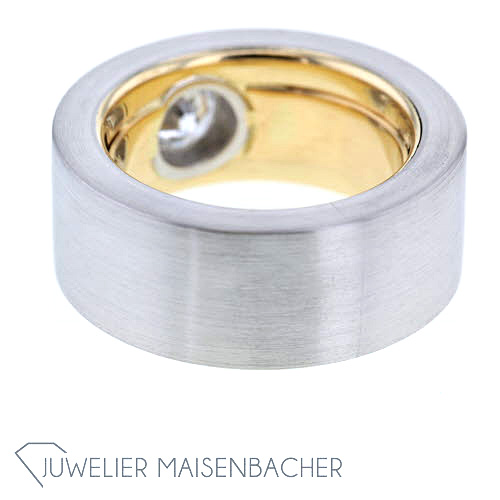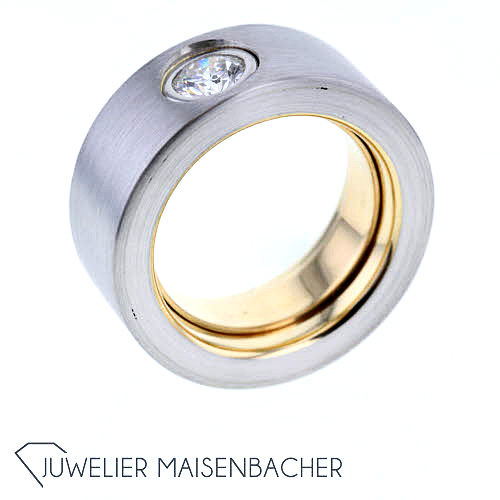 Moderner ausgefallener Solitär-Ring mit Brillant Gold Dieser im Design einzigartige Ring sucht seinesgleichen. Eine wunderschöne Kombination aus 750/-Weiß-und Gelbgold. Diamant im Brillantschliff ca 0,98 ct. in einer gelbgold Zargenfassung. Farbe: Top Wesselton, Feines Weiß (G) Reinheit: SI 2 Ringweite: 59 (Ã19) Ringschiene: 10,9mm x 4,4mm Außergewöhnliche Ringschiene,innen Gelbgold bombiert, außen Weißgold mattiert. Ein sehr angenehmes Tragegefühl. Bruttogesamtgewicht: 36,5 Gramm Bei Fragen zu diesem einmaligen Schmuckstück, rufen Sie uns gerne an oder schreiben uns eine Mail