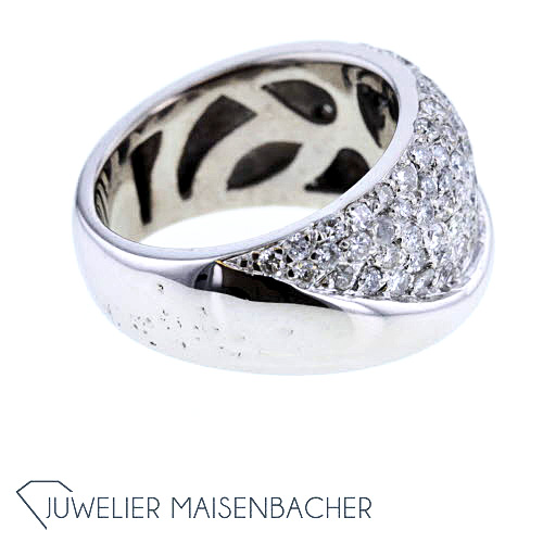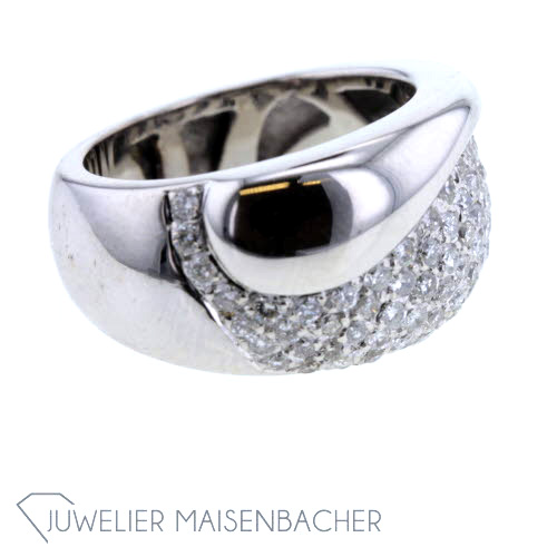 Außergewöhnlicher Ring mit strahlenden Brillanten 750/-Weißgold 80 natürliche Diamanten im Brillantschliff insgesamt ca. 0,80ct. Farbe: Top Wesselton, Feines Weiß (G)-Wesselton, Weiß (H) Reinheit: VS2-SI2 Ringweite: 55 (Ã17,5) Maße Ringschiene: ca. 6.1mm x 2,0mm Bruttogesamtgewicht: 12,57 Gramm Sie haben Fragen zu diesen einmaligen Schmuckstück, wir beraten Sie unverbindlich und individuell.