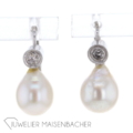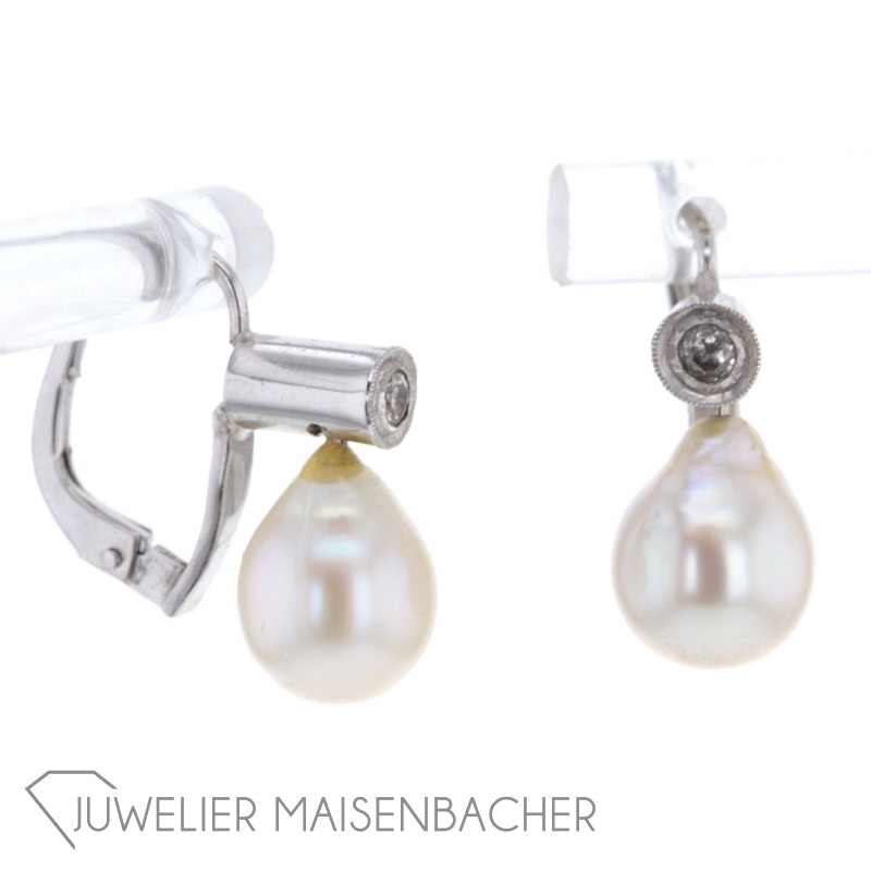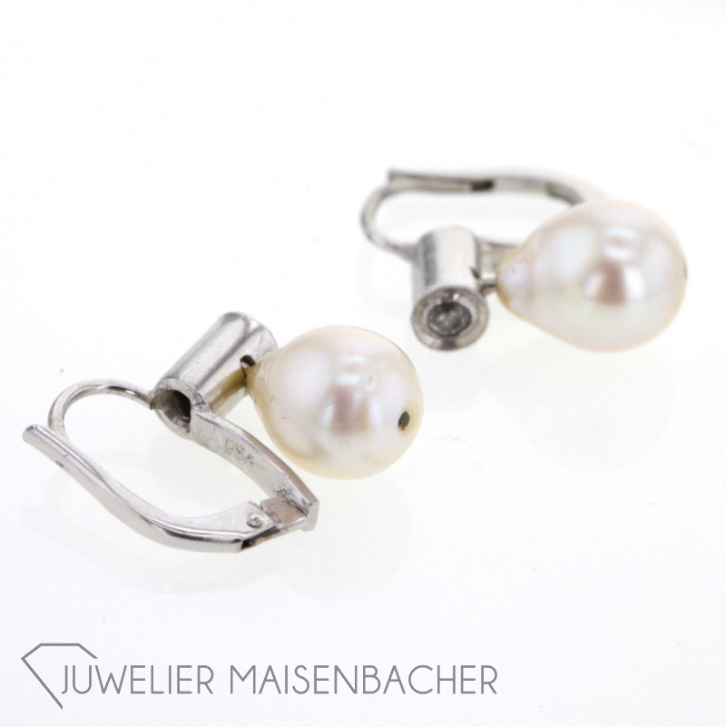 Diese Perlchatons sind aus 750/-„;“ 18kt. Weißgold hergestellt worden und oberhalb der Perle ist jeweils ein kleiner Diamant in einer Zargenfassung gefasst.