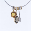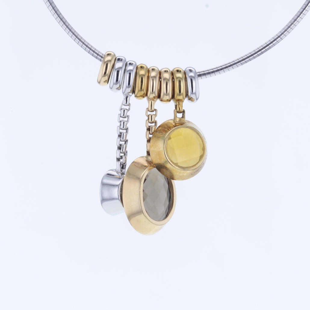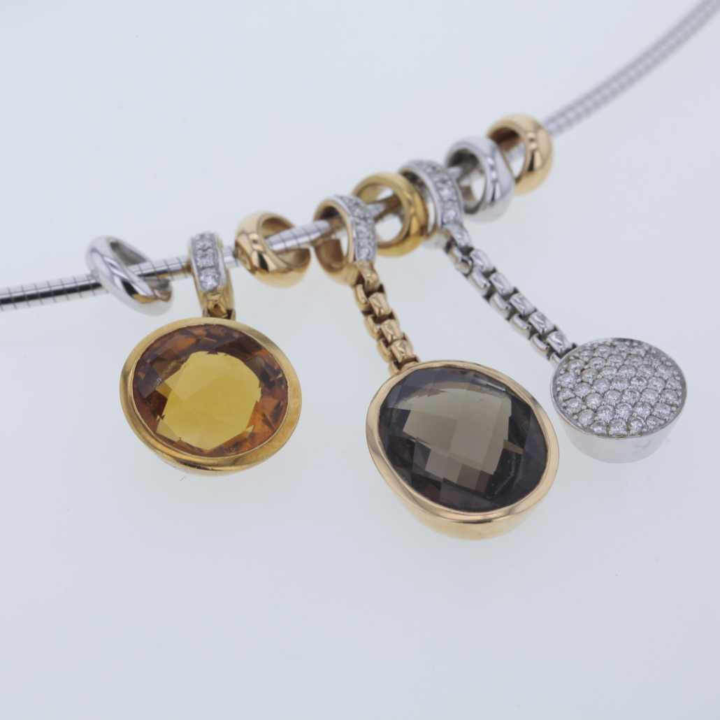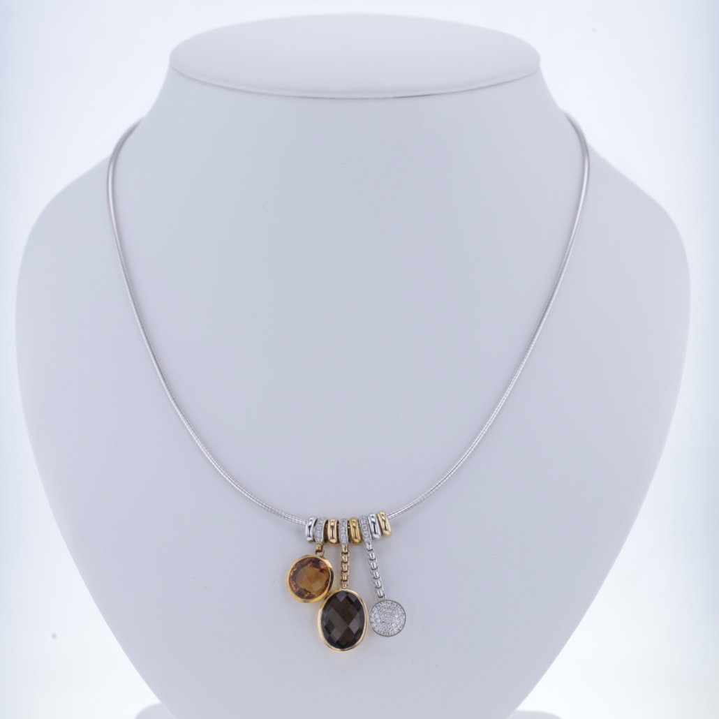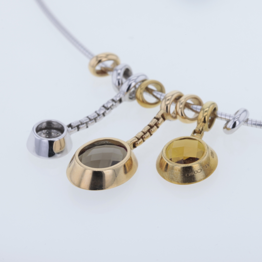 Omega Reif mit Al Coro Anhänger Palladio Edelsteinen Rauchquarz, Citrin und Brillanten 750/- Weiß-Gelbgold Länge Omega Reif ca. 51cm mit Bajonettverschluß Anhänger Palladio mit Rauchquarz Oval facettiert und 5 natürlichen Diamanten im Brillantschliff Länge: ca. 30mm 1 Anhänger Palladio mit Citrin rund facettiert mit 5 natürlichen Diamanten im Brillantschliff Länge: ca. 23mm à 13,3mm 1 Anhänger Palladio mit 37 natürlichen Diamanten im Brillantschliff Länge: ca. 30mm à 9,7mm insgesamt ca. 0,50ct. Farbe: Top Wesselton, feines Weiß (G) Reinheit: VVS 4 kleine ovale Zwischenteile ca. 7,5mm x 2,4mm Bruttogesamtgewicht: 28,6 Gramm Sie haben Fragen zum Collier von Al Coro, wir beraten Sie gerne individuell und unverbindlich.