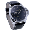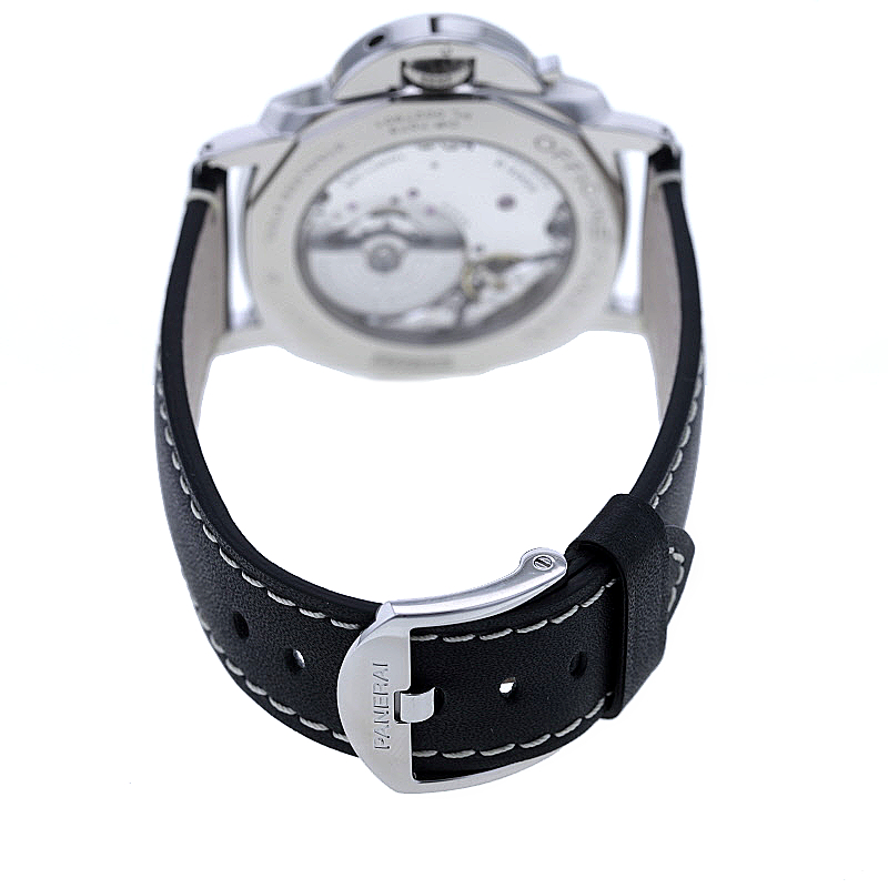 Getragen wird die Uhr an einem stilvollen braunen Kaufmann-Lederarmband mit 24 mm Stegbreite, das die markante Erscheinung der Panerai perfekt ergänzt. Die originale Dornschließe aus Edelstahl sorgt für sicheren Halt und authentische Markenästhetik.