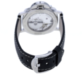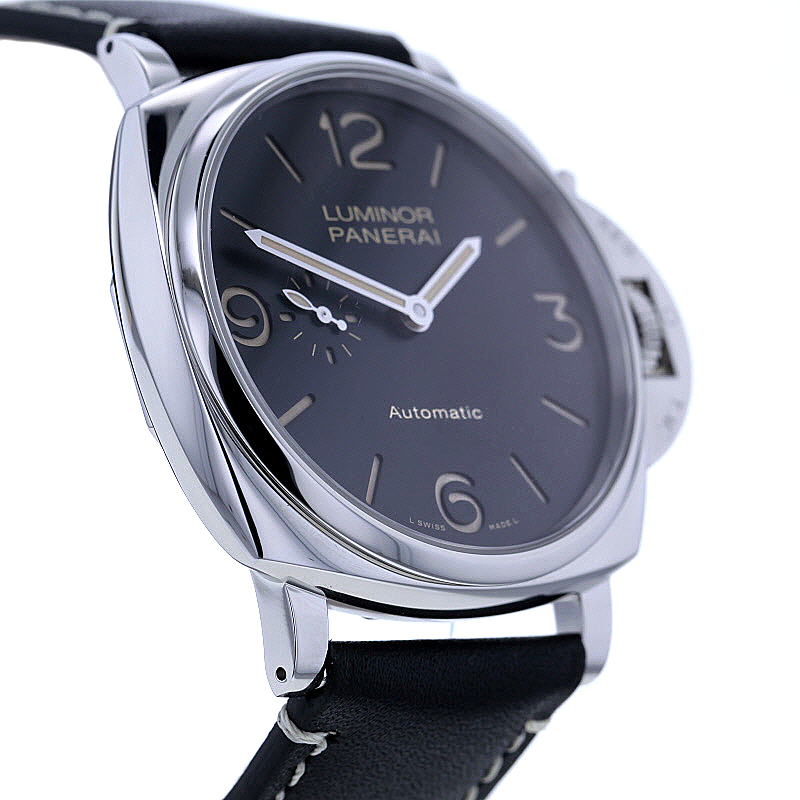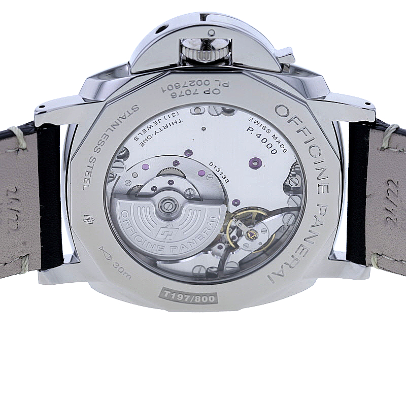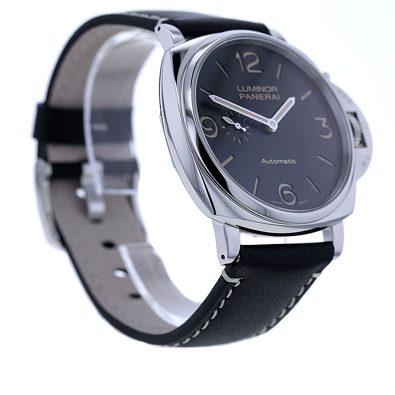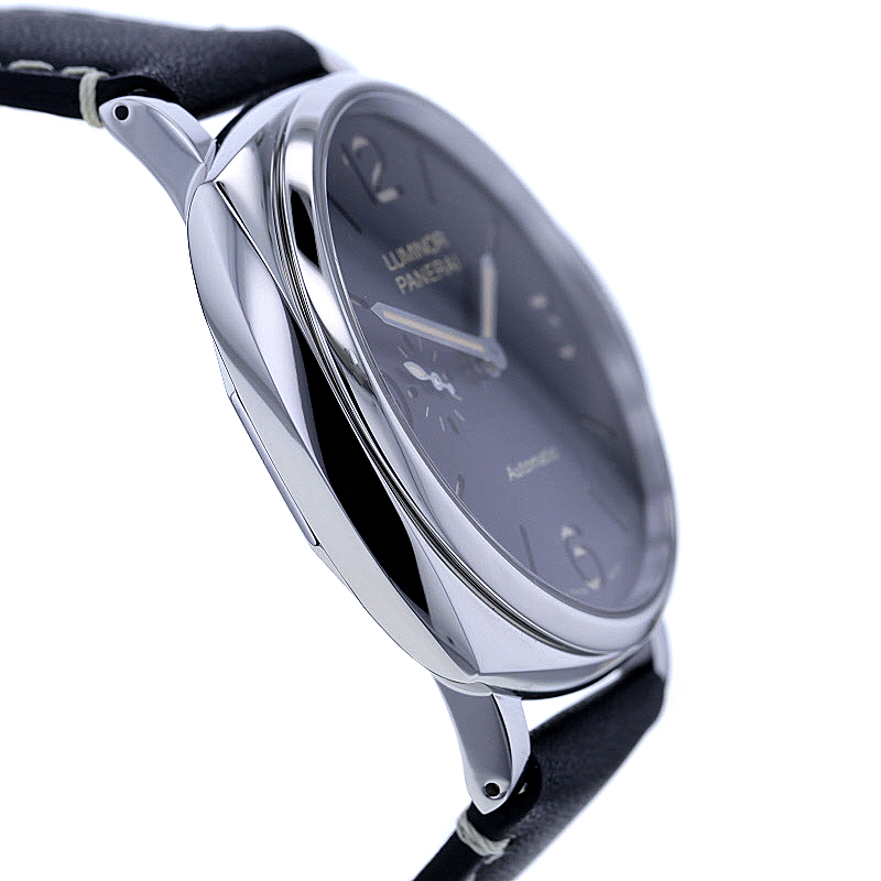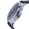 Das runde Edelstahlgehäuse misst großzügige 45 mm im Durchmesser, bleibt mit einer Höhe von nur 10,9 mm jedoch außergewöhnlich elegant für eine Panerai dieser Klasse. Gerade diese gelungene Balance aus Präsenz und Tragbarkeit macht die Luminor Due so besonders. Die Edelstahl-Lünette unterstreicht den puristischen, sportlichen Charakter des Modells und rahmt das tiefschwarze Zifferblatt auf eindrucksvolle Weise ein. Die typische kleine, dezentrale Sekunde sorgt für eine harmonische Gliederung und verleiht dem klaren Design zusätzliche Dynamik.