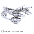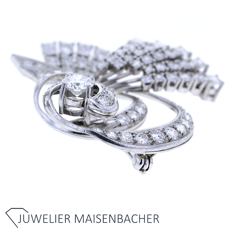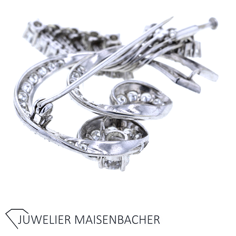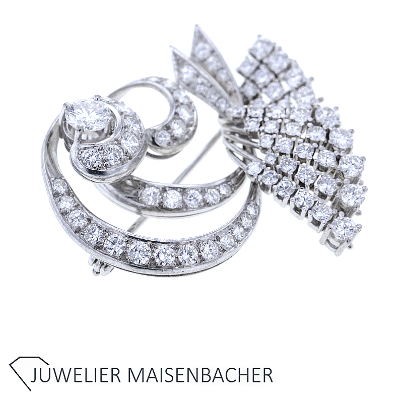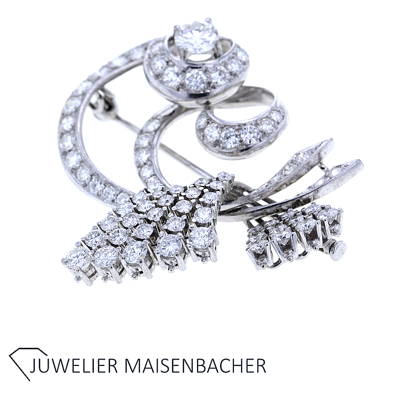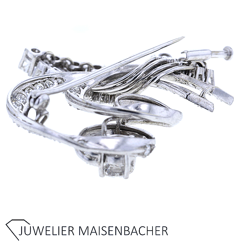 Besetzt ist dieses außergewöhnliche Schmuckstück mit insgesamt 57 natürlichen Diamanten im Brillantschliff mit einem Gesamtgewicht von ca. 3,08 ct. Die Steine zeichnen sich durch ihre schöne Farbqualität Weiß / Wesselton (H) sowie eine Reinheit von VS1 bis VS2 aus. Dadurch entsteht ein brillantes, lebendiges Funkeln, das die elegante Linienführung der Brosche wirkungsvoll betont und ihr eine luxuriöse Lichtwirkung verleiht.