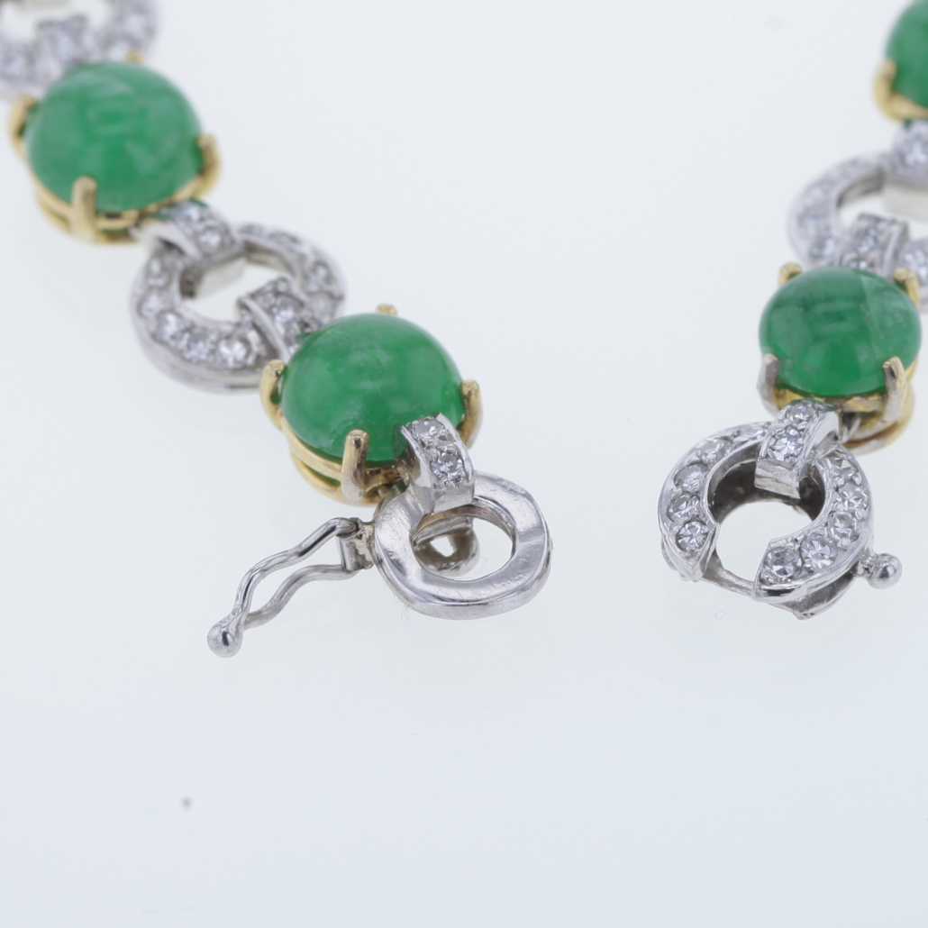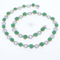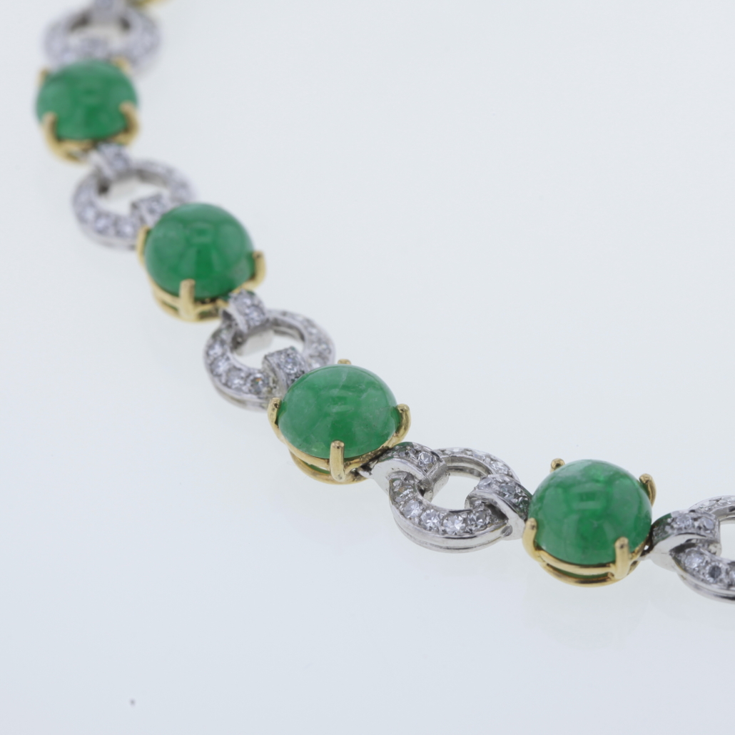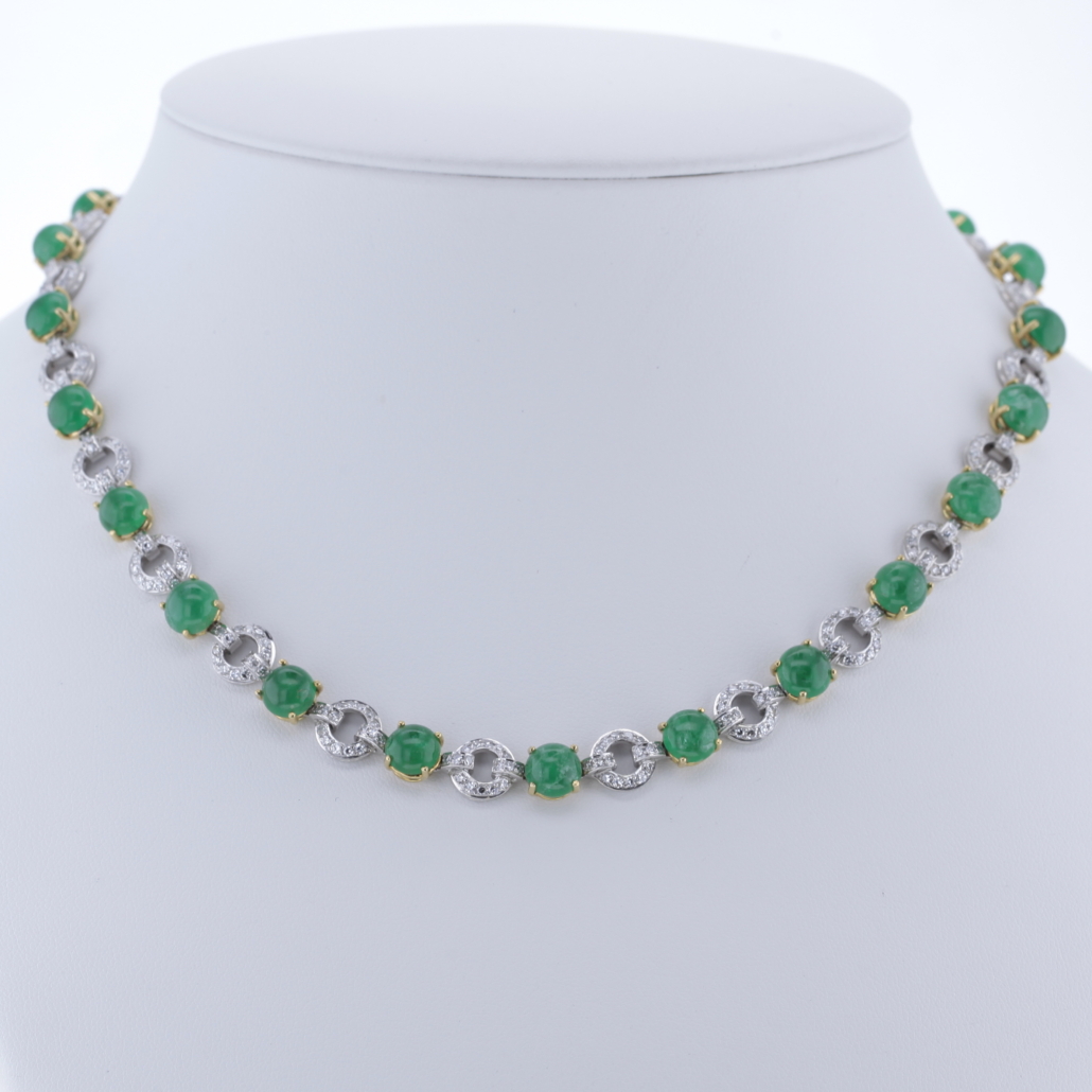 Wunderschönes Collier mit Smaragd und Diamanten von René Kern 750/-Gelb-Weißgold 312 natürliche Diamanten im Achtkantschliff insgesamt ca. 3,1ct. Farbe: Wesselton, Weiß (H)- leicht getöntes Weiß (I) Reinheit: VS-SI à Diamantglied ca. 8,7mm 24 natürliche Smaragde in Cabochon Schliff à Smaragdglied ca. 7,9mm insgesamt ca. 32,8 ct. Länge: ca. 44,5cm Bruttogesamtgewicht: 55,7 Gramm Zur perfekten Kombination erhalten Sie das Armband mit der Art. Nr.: COMAR20230810-03 und Ohrstecker COMOH20230810-05 Sie haben Fragen zu diesen exklusiven Schmuck, wir beraten Sie gerne individuell und unverbindlich.