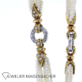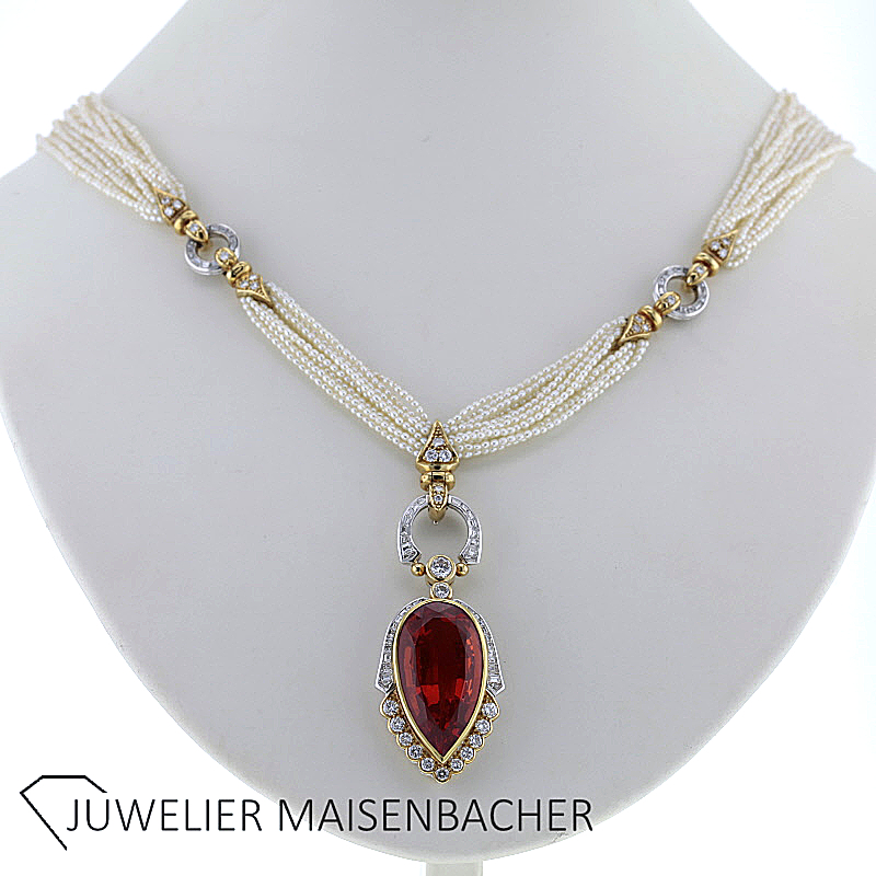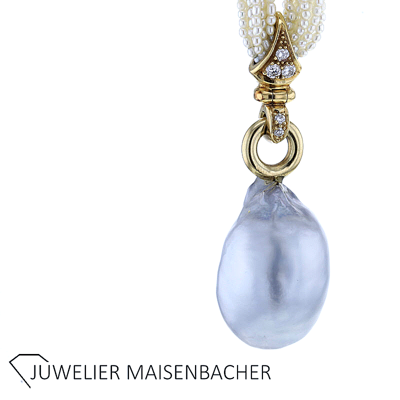 Außergewöhnliches Perlencollier mit auswechselbaren Anhängern 750/-Gelbgold und Platin montiert 12 Stränge aus Orientperle mit 2 Platinringen zusammengehalten. Ausgefaßt mit Diamant Trapez und Pavee ausgefaßten Auslaufteilen. 750/-Gelbgold 1 großer Feueropaltropfen (Mexico) als Anhänger montiert ca. 38,25 ct. feine Farbe Carmoisiert mit Brillanten und Diamanten in 750/- Weiß-/Gelbgold Insgesamt sind 145 Diamanten verarbeitet ca. 4,97 ct. Farbe: River Reinheit: Lupenrein weiterer Anhänger ist eine wunderschöne Südseetropfenperle natur in grauer Farbe ca. 40ct. Tragelänge des Colliers mit Opal-Tropfen ca. 51cm mit Expertise