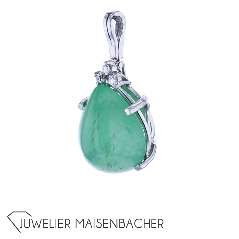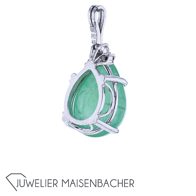 Anhänger mit großem Smaragden und Diamanten 585/- Weißgold 3 Diamanten im Achtkantschliff insgesamt ca. 0,06ct. Farbe: Wesselton, Weiss (H) Reinheit: SI1-SI2 Smaragd Tropfen im Cabochon Schliff, ca. 6.24ct. Maße Smaragd: ca.16,6mm x 12,8mm Tragelänge incl. Oese: 27,9mm Bruttogesamtgewicht: 5,12 Gramm