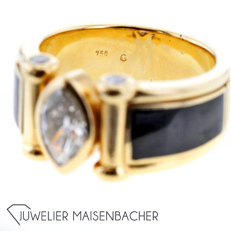 Solitär-Ring mit Diamant und Brillant 750/- Gelbgold 3 natürliche Diamanten im Brillan-und Marquiseschliff insgesamt ca. 1.06ct. Farbe: Wesselton, Weiß (H) Reinheit: VS2-SI2 Ringweite: 52 (Ã 16,8) Ringkopf Breite ca. 10,5mm Bruttogesamtgewicht: ca. 12,81 Gramm