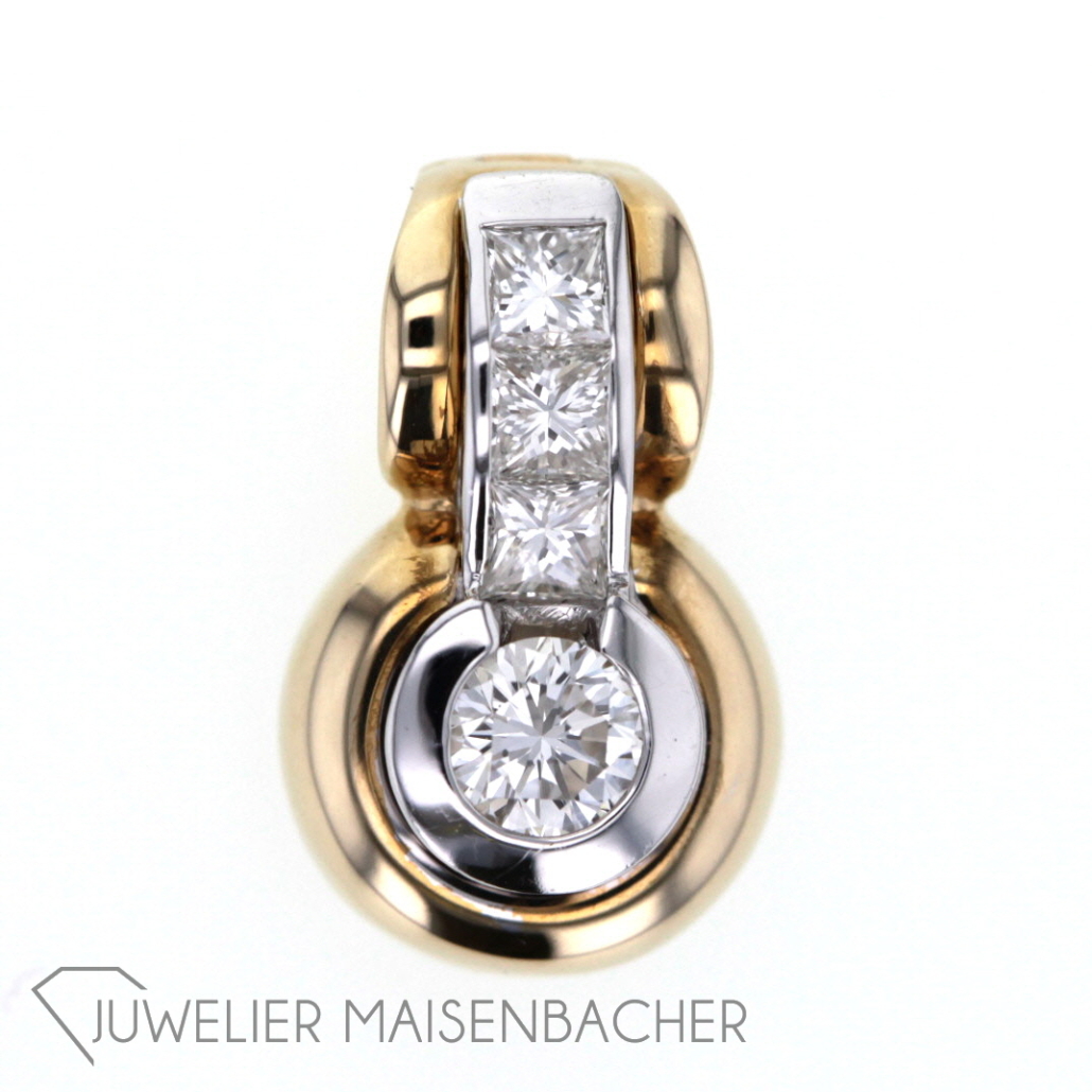 Ein Soltaire-Anhänger als Vario-Clip, so dass er auch zwischen 2 Perlen einer Perlenkette getragen werden kann 585/-Gelb-Weißgold 1 natürlicher Diamant im Brillantschliff 3 natürliche Diamanten im Princesscut insgesamt: ca. insg. ca. 0,81 ct (Bril. 0,36 ct) Farbe: Wesselton, Weiß (H)- leicht getöntes Weiß (I) Reinheit: SI1 Maße: 19,6mm x 12,1mm Bruttogesamtgewicht: 6,71 Gramm Sie haben Fragen zu diesen einzigartigen Anhänger, wir beraten Sie gerne individuell und unverbindlich