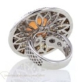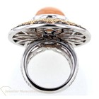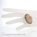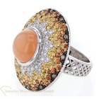 Mehr geht nicht, absoluter Luxus Ein auffälliger Statementring mit einem Mondstein, umrundet von farbigen Brillanten, die ähnlich der Sonne strahlen. 750/-Weißgold 144 Diamanten im Brillantschliff -Pavé gefasst insgesamt ca. ca. 3,18 ct wunderschöner Mondstein, Chabochon rund à ca. 10,8mm Ringweite: 53 (mit eingearbeiteter Feder zur Regulierung der Ringweite) Ringkopf: à ca. 33 mm Maße durchbrochener Ringschiene: 5,5mm – 1,6mm Bruttogesamtgewicht: ca. 24,6 Gramm Bei Fragen zu diesem einmaligen Schmuckstück, rufen Sie uns gerne an oder schreiben uns eine Mail.