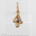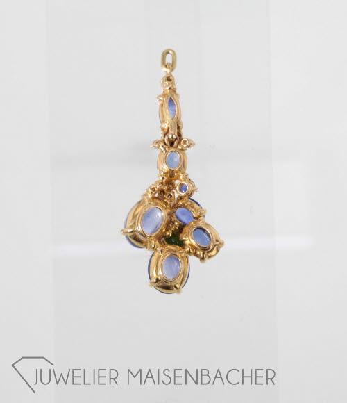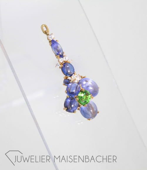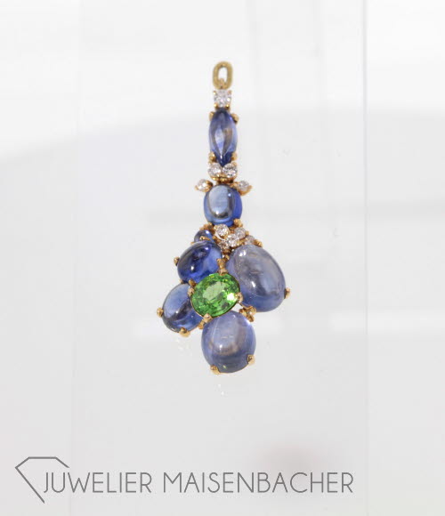 Anhänger mit Saphir,Brillant und leuchtend grünen Tsavorith 750/-Gelbgold 5 Diamanten im Brillantschliff insgesamt ca. 0,05 ct. Farbe: Wesselton, Weiß (H) Reinheit: VS1-VS2 7 Saphire im Cabochon- Schliff ein leuchten grüner Edelstein Granat Tsavorith Maße Anhänger: ca. 41,7 mm x 17,0mm Bruttogesamtgewicht: 5,71 Gramm