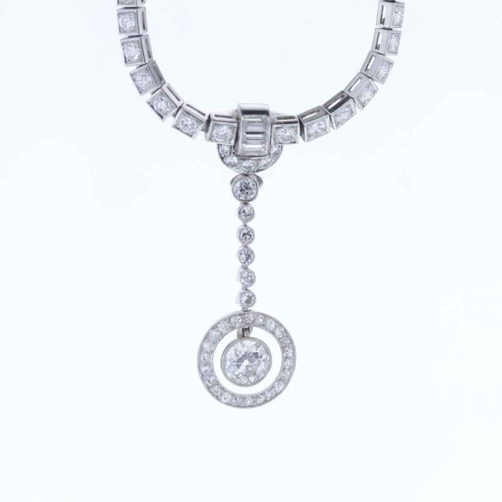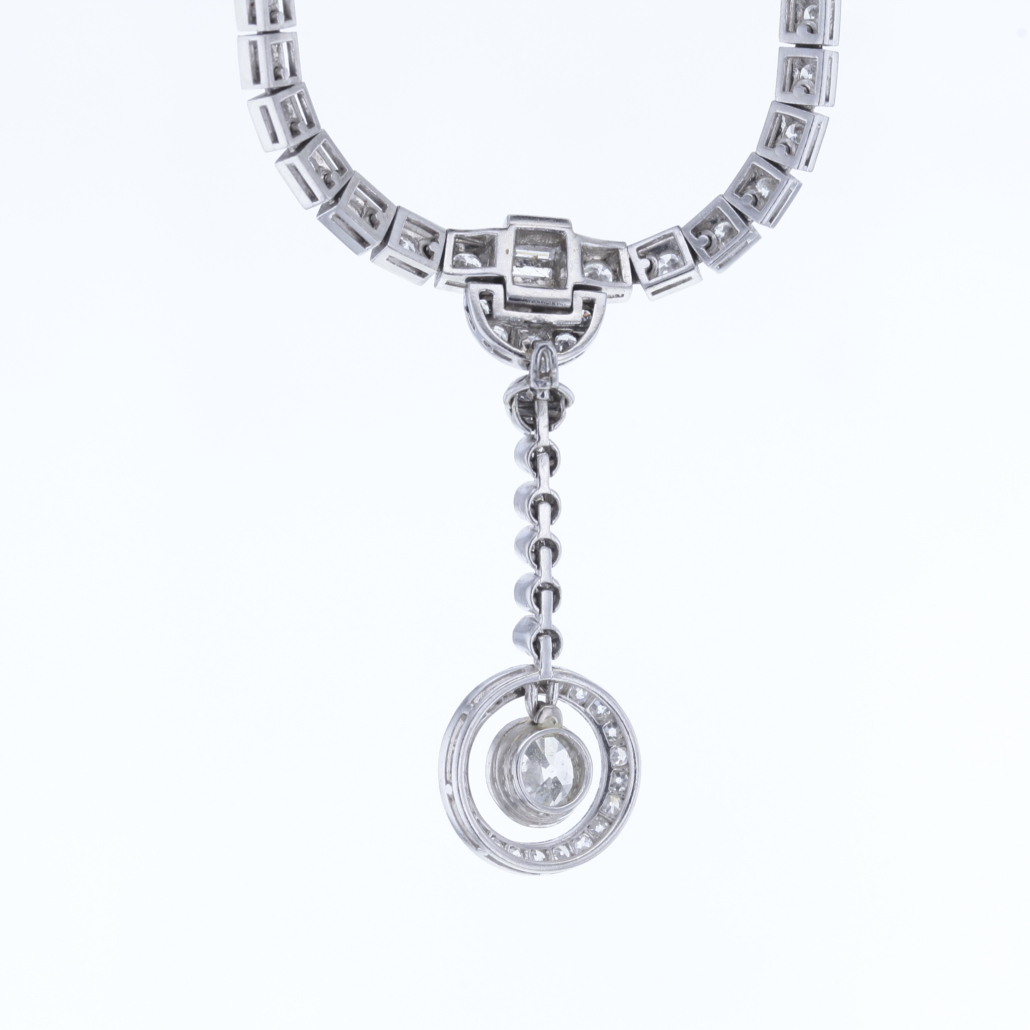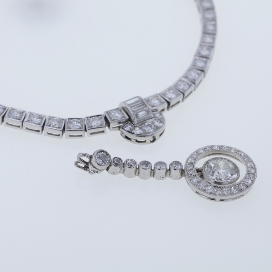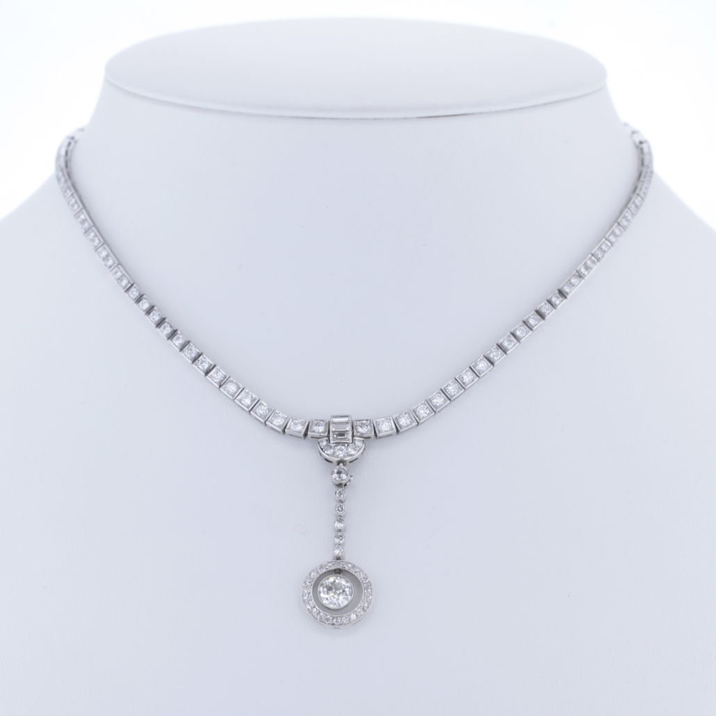 UNIKAT Außergewöhnliches Collier verwandelbar in Y-Collier mit Diamanten und Brillanten 950/-Platin ein ca. 1,1ct. Diamant im Altschliff schwingt locker in einer Fassung von Diamanten Farbe: getöntes Weiß (J) Reinheit: P2 210 natürliche Diamanten teilweise Achtkant, Baguette und Brillantschliff insgesamt ca. 4,4ct. Farbe: Wesselton, Weiß (H)-leicht getöntes Weiß (J) Reinheit: SI-P1 Länge Collier ohne Verlängerung ca. 40cm Tragelänge mit Anhänger ca. 43cm Bruttogesamtgewicht: 35,7 Gramm Sie haben Fragen zu diesem handgearbeiteten Collier, wir beraten Sie gerne individuell und unverbindlich.