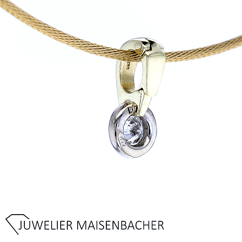 Gefertigt ist das Schmuckstück in hochwertigem 585er Bicolor-Gold und besitzt ein Bruttogesamtgewicht von ca. 1,4 g. Die Ausführung als Vario-Clipanhänger bietet eine praktische und vielseitige Tragemöglichkeit. So lässt sich der Anhänger flexibel und komfortabel mit unterschiedlichen Ketten kombinieren.