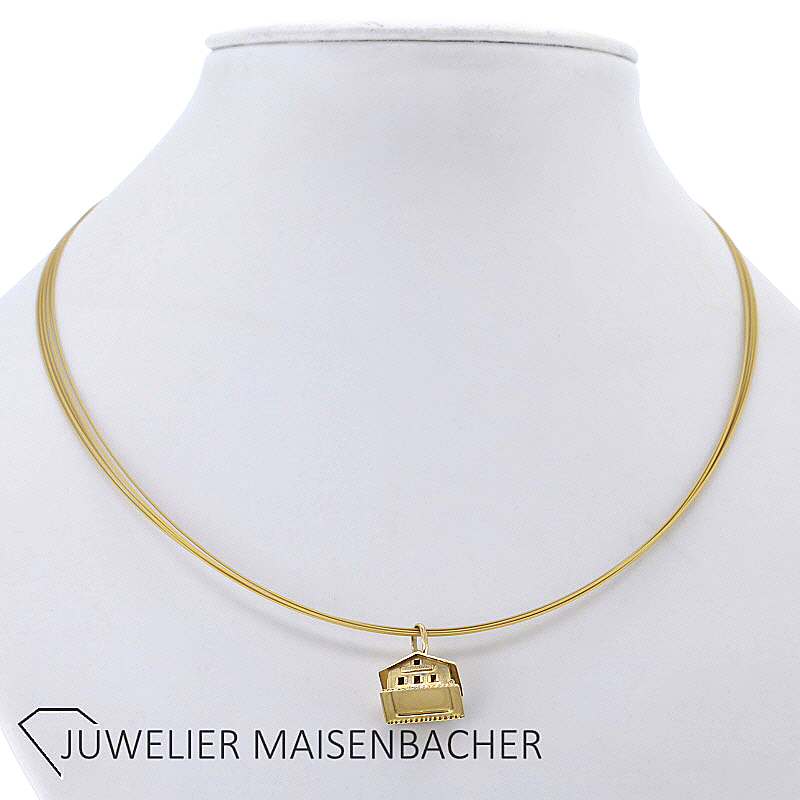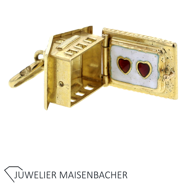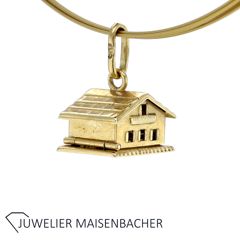 Eine besondere Raffinesse dieses Anhängers ist seine aufklappbare Konstruktion. Das Haus lässt sich öffnen und gibt ein liebevoll gestaltetes Inneres frei. Im Inneren befindet sich ein dekoratives Element mit zwei Herzmotiven, die in Emaille gearbeitet sind. Die farblich abgesetzten Herzen bilden einen wunderschönen Kontrast zum warmen Glanz des Gelbgoldes und verleihen dem Anhänger eine romantische und persönliche Note. Diese Gestaltung macht den Anhänger zu einem symbolträchtigen Schmuckstück – etwa als Zeichen für Liebe, Zuhause oder Verbundenheit.