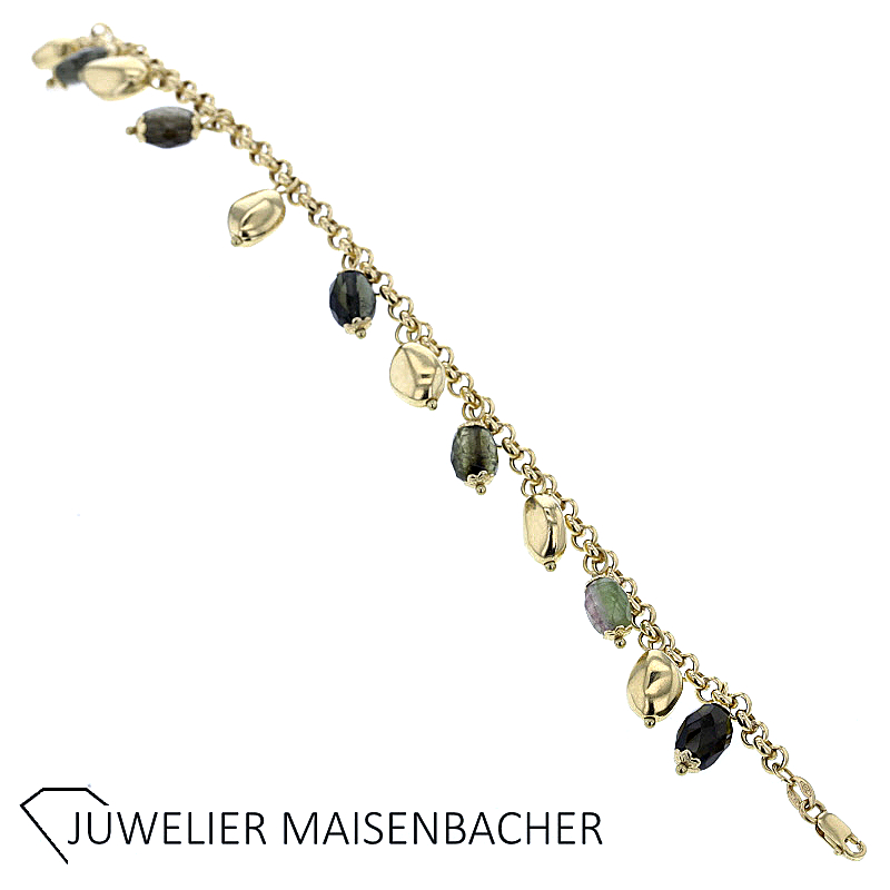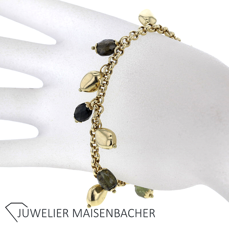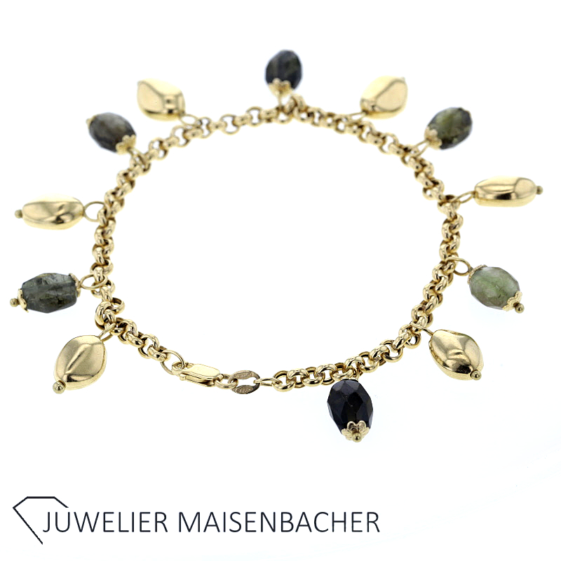 Dieses wunderschöne Bettelarmband ist ein elegantes Schmuckstück, das aus hochwertigem 750er Gelbgold gefertigt ist. Das Armband besticht durch sein ansprechendes Erbsenmuster und bietet eine harmonische Kombination aus Edelsteinen und goldenen Anhängern. Mit insgesamt 12 einzelnen Anhängern, darunter 6 funkelnde Edelsteine und 6 stilvolle Goldanhänger, bietet dieses Armband eine Vielzahl von Möglichkeiten zur individuellen Gestaltung. Die Auswahl der Edelsteine verleiht dem Armband nicht nur Farbe, sondern auch einen Hauch von Luxus und Persönlichkeit. Die Länge des Armbands beträgt 19 cm, was es zu einer idealen Wahl für die meisten Handgelenke macht. Die Breite des Erbsenmuster-Armbands beträgt ca. 3,9 mm, was ihm eine zarte, aber dennoch auffällige Präsenz verleiht. Mit einem Bruttogesamtgewicht von ca. 12,3 Gramm liegt das Armband angenehm am Handgelenk und vermittelt ein Gefühl von Wertigkeit und Eleganz. Dieses Bettelarmband ist perfekt für den täglichen Gebrauch oder besondere Anlässe und lässt sich wunderbar mit anderen Schmuckstücken kombinieren. Es ist ein zeitloses Accessoire, das sowohl Stil als auch Individualität verkörpert – ein ideales Geschenk für sich selbst oder einen geliebten Menschen! Haben Sie Fragen zu diesem wunderschönen Bettelarmband? Rufen Sie uns gerne an oder schreiben uns eine Mail.