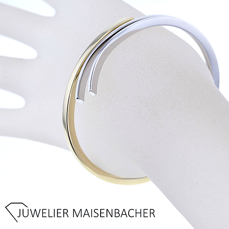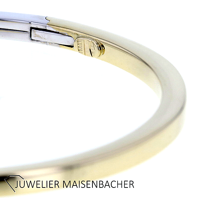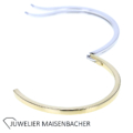 Zeitloser ovaler geschwungener Armreif mit Schanier in 3Treppen Design 585/-Gelb-Weißgold Innendurchmesser ca. 58,5mm Außendurchmesser ca 66,1mm Breite Kopf: ca.16,6mm Maße unten am Schanier: 3,4mm x 3,8mm Bruttogesamtgewicht: 12,8 Gramm Sie haben Fragen zu diesen außergewöhnlichen Armreif, wir beraten Sie gerne individuell und unverbindlich.